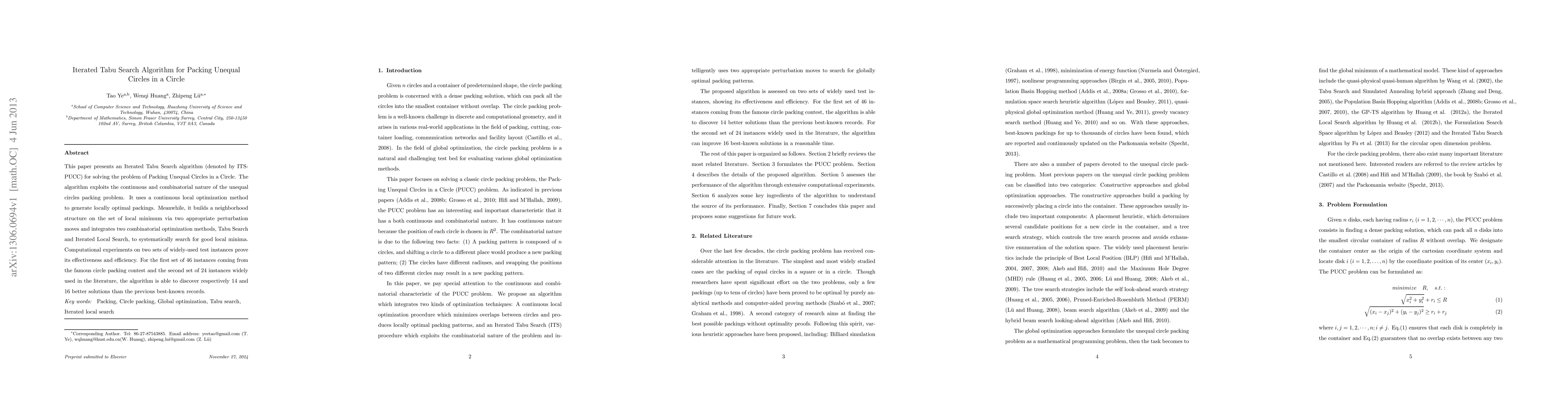 This paper introduces an Iterated Tabu Search algorithm (ITS-PUCC) for packing unequal circles within a circle, combining continuous local optimization and combinatorial methods to find optimal solutions. Computational experiments demonstrate its effectiveness, outperforming previous best-known solutions in two sets of test instances.
