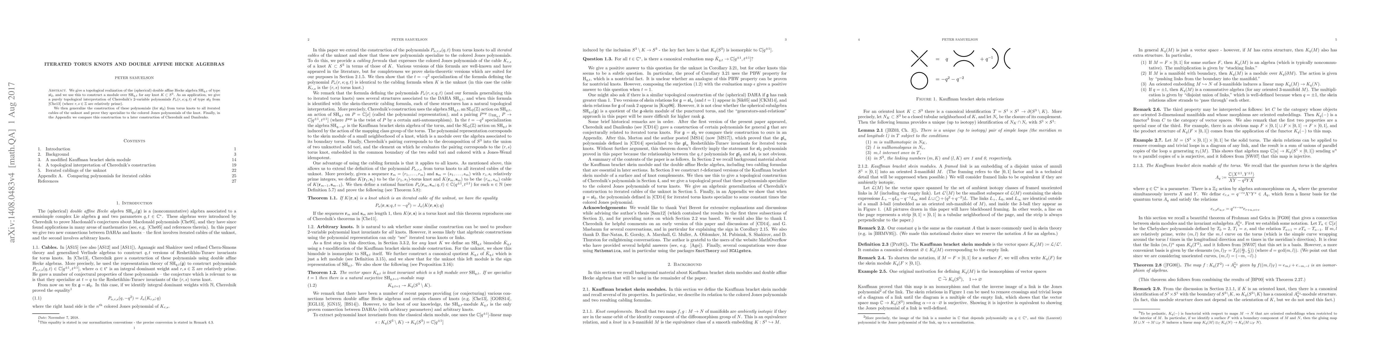 This paper constructs a topological module over the double affine Hecke algebra for any knot, providing a new interpretation of Cherednik's polynomials and proving their specialization to colored Jones polynomials for torus knots. It extends these results to iterated cables of the unknot and compares the findings with another recent study.