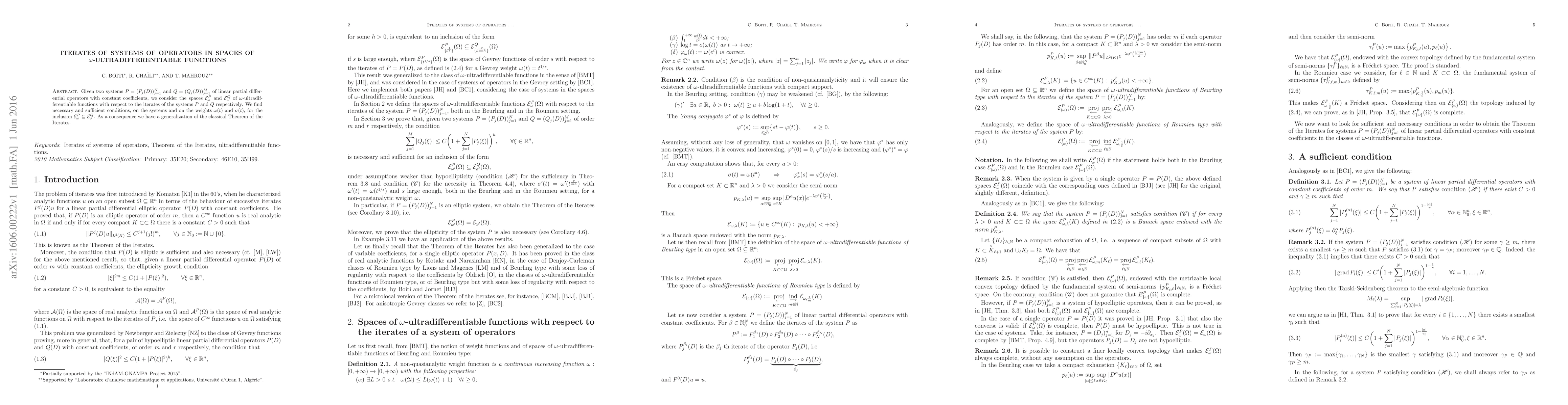 This paper investigates the inclusion of spaces of $\omega$-ultradifferentiable functions defined by systems of linear partial differential operators $P$ and $Q$. It establishes necessary and sufficient conditions for the inclusion ${\mathcal E}_\omega^P\subseteq{\mathcal E}_\sigma^Q$, generalizing the classical Theorem of the Iterates.