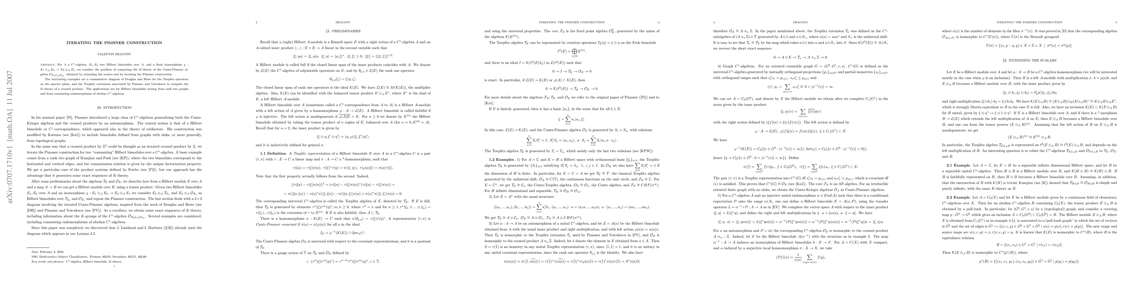 For $A$ a $C^*$-algebra, $E_1, E_2$ two Hilbert bimodules over $A$, and a fixed isomorphism $\chi : E_1\otimes_AE_2\to E_2\otimes_AE_1$, we consider the problem of computing the $K$-theory of the Cuntz-Pimsner algebra ${\mathcal O}_{E_2\otimes_A{\mathcal O}_{E_1}}$ obtained by extending the scalars and by iterating the Pimsner construction. The motivating examples are a commutative diagram of Douglas and Howe for the Toeplitz operators on the quarter plane, and the Toeplitz extensions associated by Pimsner and Voiculescu to compute the $K$-theory of a crossed product. The applications are for Hilbert bimodules arising from rank two graphs and from commuting endomorphisms of abelian $C^*$-algebras.