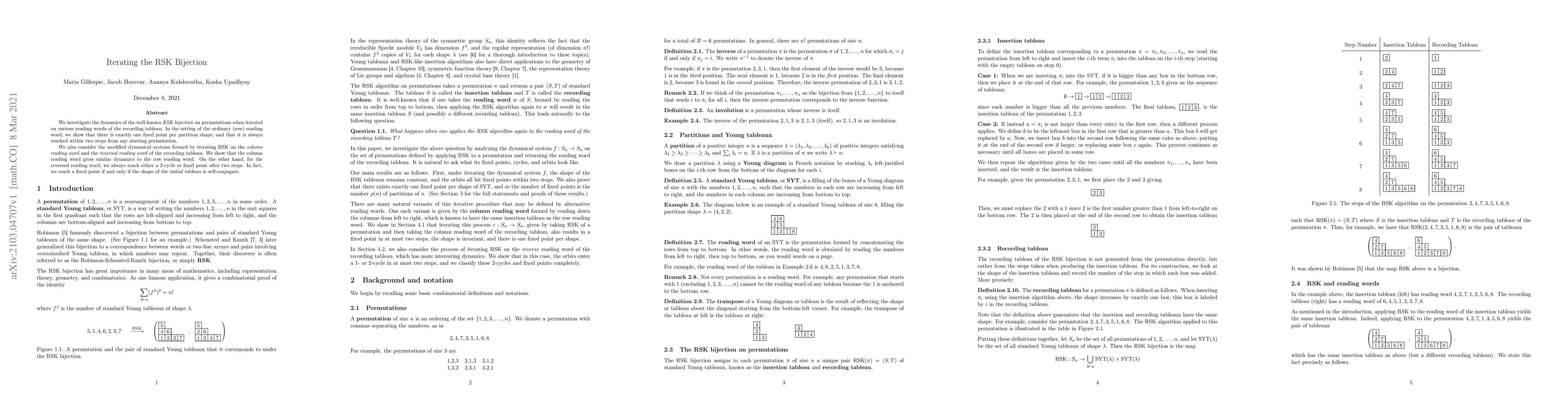 This paper explores the dynamics of the RSK bijection on permutations under iteration using different reading words. It finds that the ordinary reading word leads to a unique fixed point per partition shape reached within two steps. It also examines the column and reversed reading words, showing similar dynamics for the former and fixed or 2-cycle outcomes for the latter, with fixed points occurring only for self-conjugate shapes.