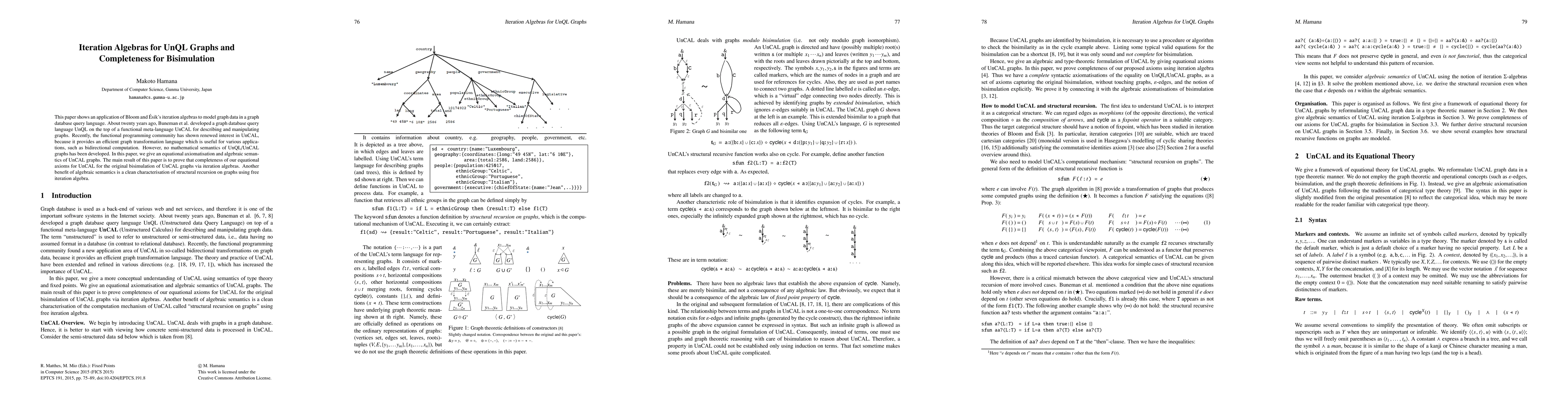This paper applies iteration algebras to model graph data in UnQL, a graph database query language, and provides an equational axiomatisation and algebraic semantics for UnCAL graphs. The main result is proving the completeness of these axioms for bisimulation, offering a clear structural recursion characterization on graphs.