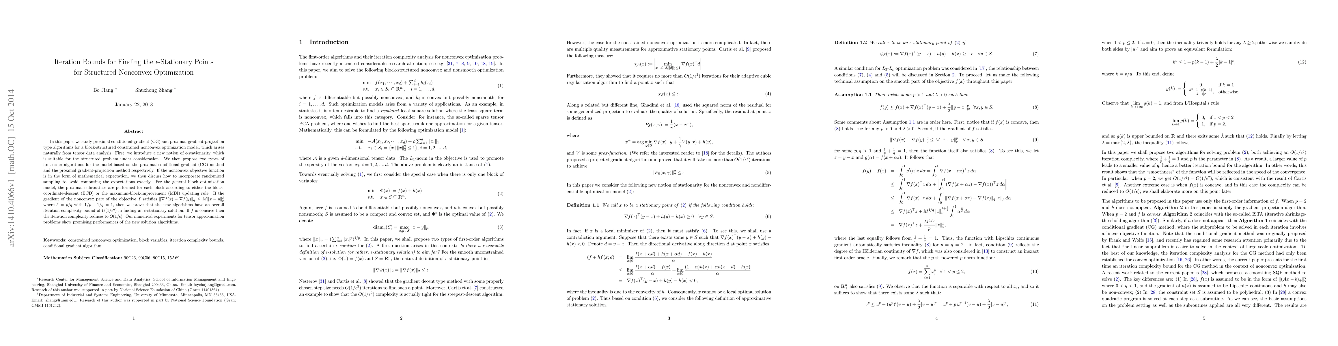 This paper proposes new algorithms for solving structured nonconvex optimization problems arising from tensor data analysis, introducing a novel $\epsilon$-stationarity concept. It presents proximal conditional-gradient and gradient-projection methods, incorporating randomized sampling for efficiency, and proves iteration complexity bounds of $O(1/\epsilon^q)$ for general cases and $O(1/\epsilon)$ for concave functions. Numerical experiments demonstrate the effectiveness of the proposed algorithms.