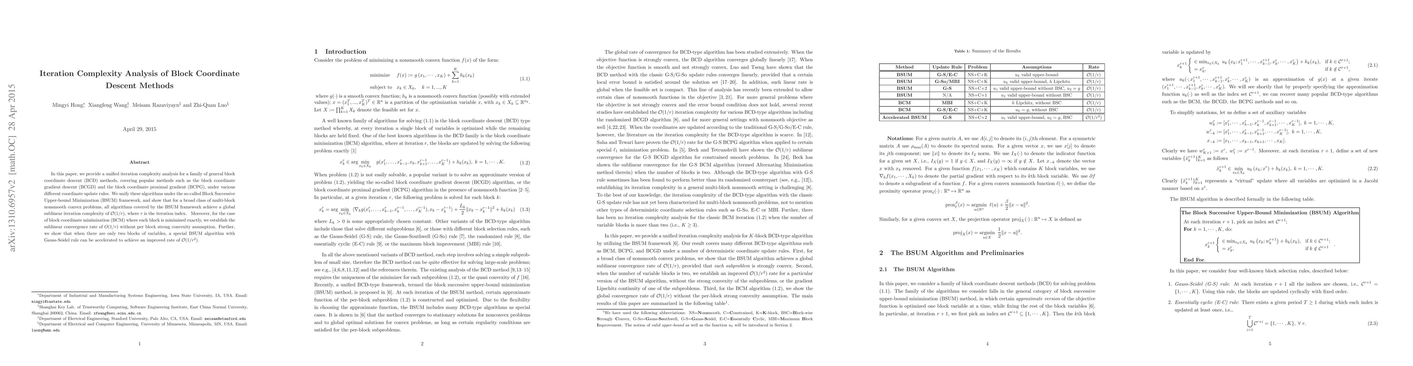 This paper provides a unified iteration complexity analysis for various block coordinate descent methods, showing they achieve a global sublinear convergence rate of $O(1/r)$. It also demonstrates that under exact block minimization, convergence remains sublinear without requiring per block strong convexity.