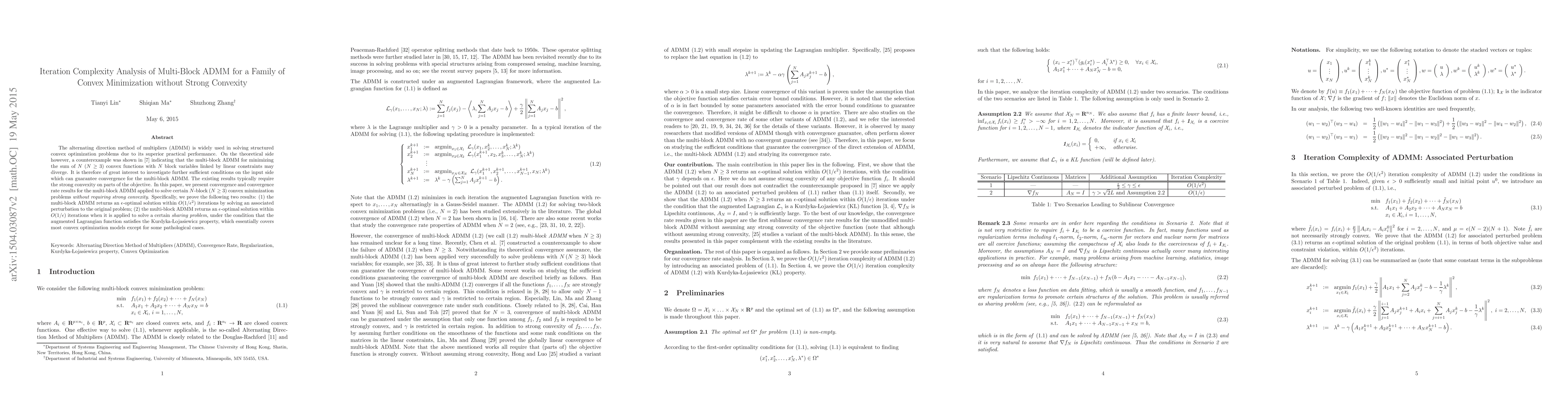 This paper investigates the convergence and iteration complexity of multi-block ADMM for solving $N$-block convex minimization problems without requiring strong convexity. It proves that the method converges to an $\epsilon$-optimal solution in $O(1/\epsilon^2)$ iterations for general cases and in $O(1/\epsilon)$ iterations under certain conditions for specific sharing problems.