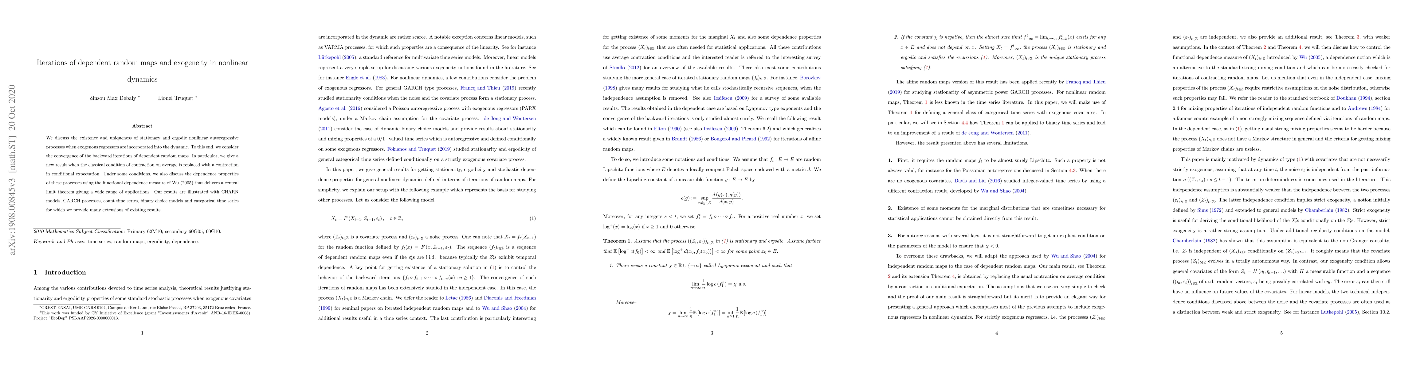 This paper investigates the existence and uniqueness of stationary and ergodic nonlinear autoregressive processes with exogenous regressors, focusing on the convergence of backward iterations of dependent random maps. It introduces a new contraction condition in conditional expectation, replacing the classical average contraction, and provides explicit control over the functional dependence, extending existing results to various applications.