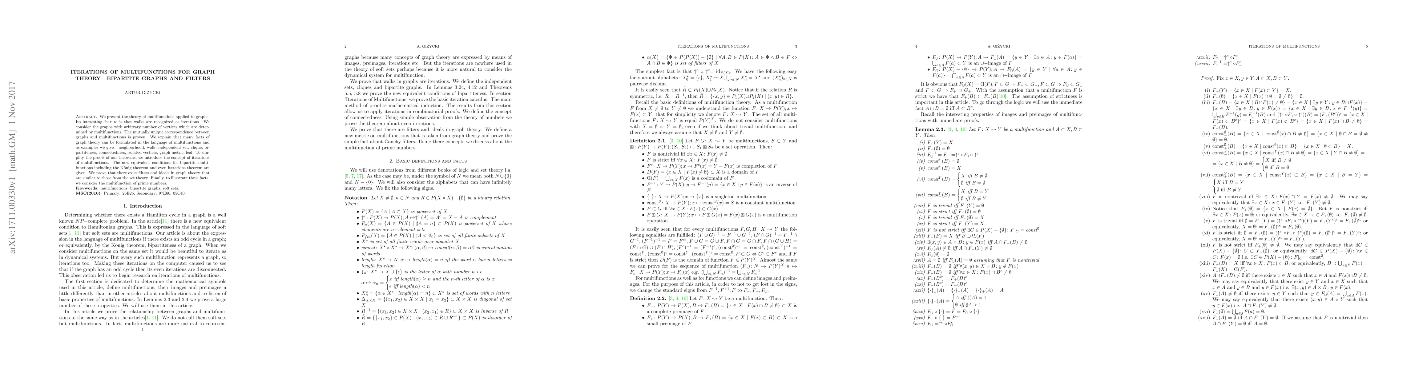 We present the theory of multifunctions applied to graphs. Its interesting feature is that walks are recognized as iterations. We consider the graphs with arbitrary number of vertices which are determined by multifunctions. The mutually unique correspondence between graphs and multifunctions is proven. We explain that many facts of graph theory can be formulated in the language of multifunctions and as examples we give$\colon$ neighborhood, walk, independent set, clique, bipartiteness, connectedness, isolated vertices, graph metric, leaf. To simplify the proofs of our theorems, we introduce the concept of iterations of multifunctions. The new equivalent conditions for bipartite multifunctions including the K\"onig theorem and even iterations theorem are given. We prove that there exist filters and ideals in graph theory that are similar to those from the set theory. Finally, to illustrate these facts, we consider the multifunction of prime numbers.