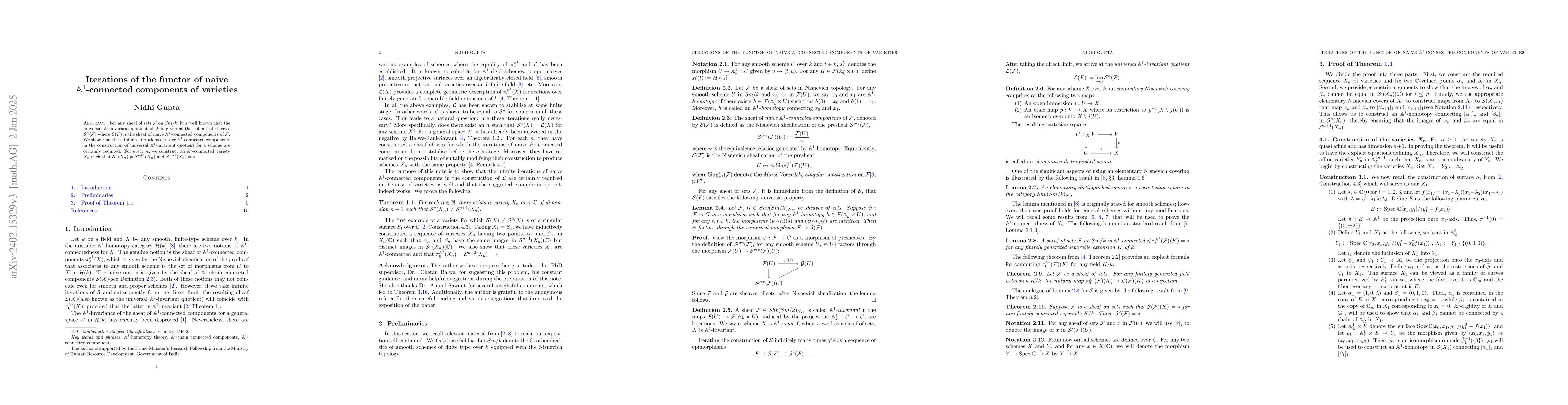 The paper explores the necessity of iterating the functor of naive $\mathbb A^1$-connected components to construct universal $\mathbb A^1$-invariant quotients for schemes. It demonstrates that these iterations are crucial by constructing an $\mathbb A^1$-connected variety $X_n$ where $\mathcal S^n(X_n) \neq \mathcal S^{n+1}(X_n)$ and $\mathcal S^{n+2}(X_n)=*$.