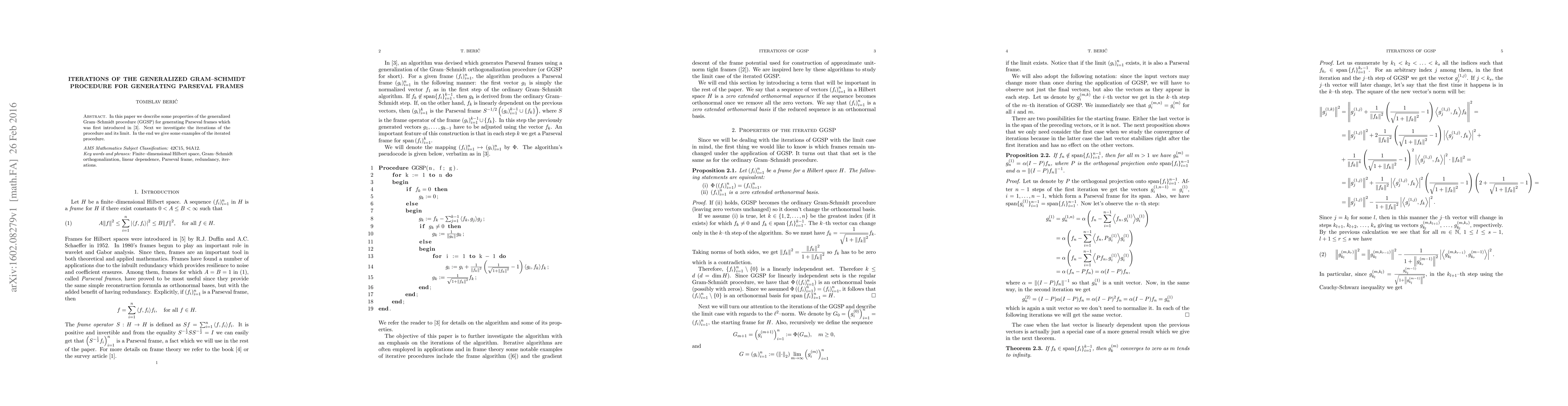 This paper explores the properties and iterations of the generalized Gram-Schmidt procedure (GGSP) for generating Parseval frames, investigating its convergence and providing examples of its iterated application.