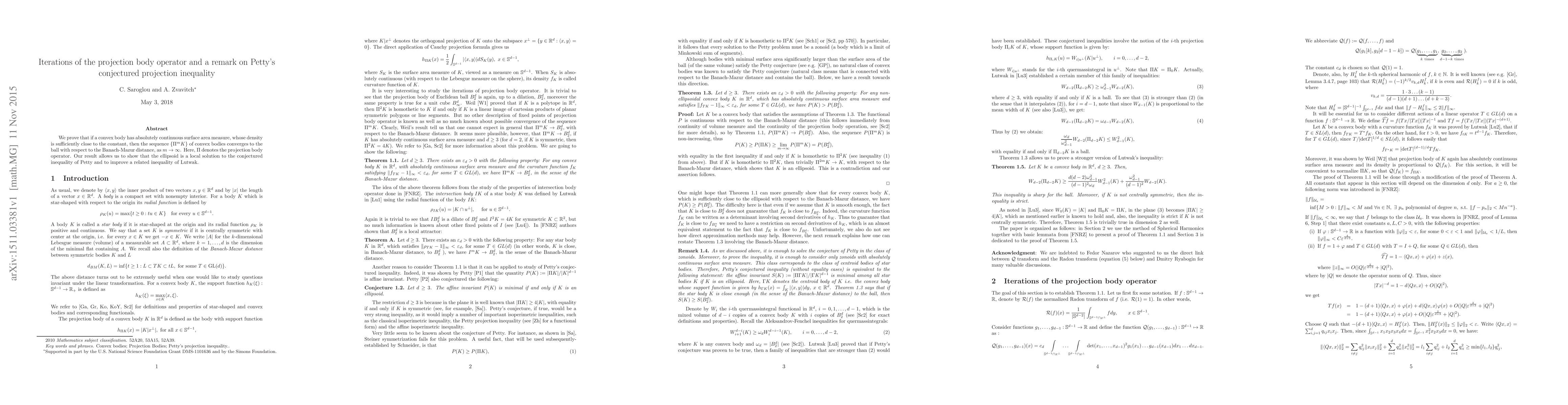 We prove that if a convex body has absolutely continuous surface area measure, whose density is sufficiently close to the constant, then the sequence $\{\Pi^mK\}$ of convex bodies converges to the ball with respect to the Banach-Mazur distance, as $m\rightarrow\infty$. Here, $\Pi$ denotes the projection body operator. Our result allows us to show that the ellipsoid is a local solution to the conjectured inequality of Petty and to improve a related inequality of Lutwak.