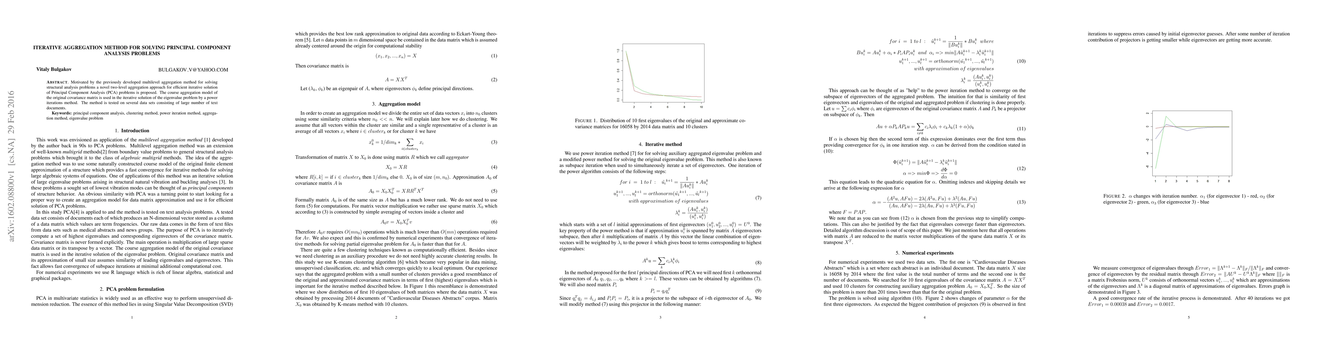 Motivated by the previously developed multilevel aggregation method for solving structural analysis problems a novel two-level aggregation approach for efficient iterative solution of Principal Component Analysis (PCA) problems is proposed. The course aggregation model of the original covariance matrix is used in the iterative solution of the eigenvalue problem by a power iterations method. The method is tested on several data sets consisting of large number of text documents.