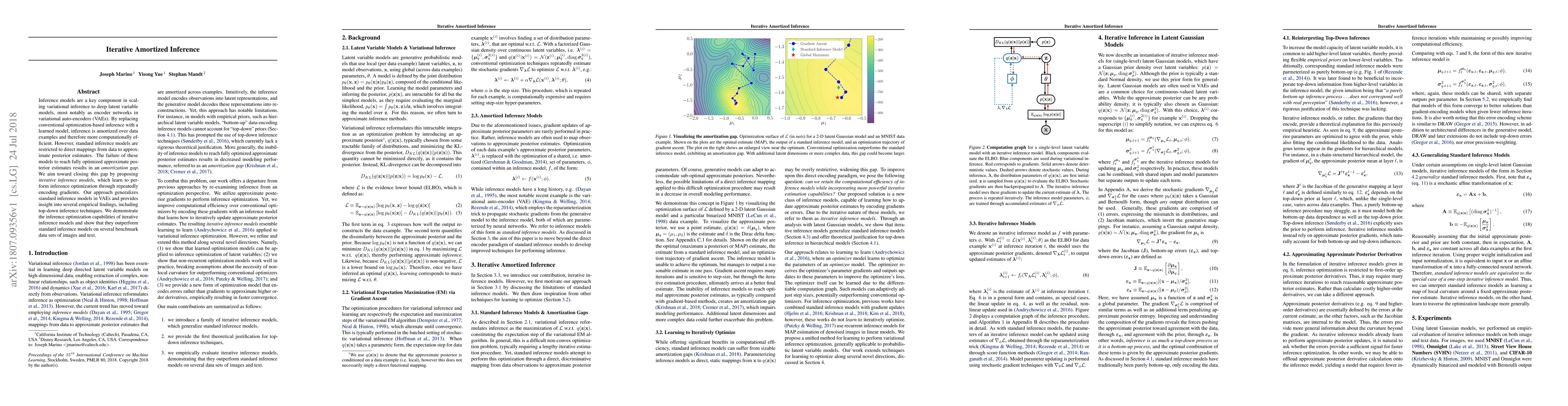 This paper proposes iterative amortized inference models to close the "amortization gap" in variational inference, enhancing computational efficiency by repeatedly encoding gradients for optimized posterior estimates. The iterative approach outperforms standard inference models on image and text benchmarks.