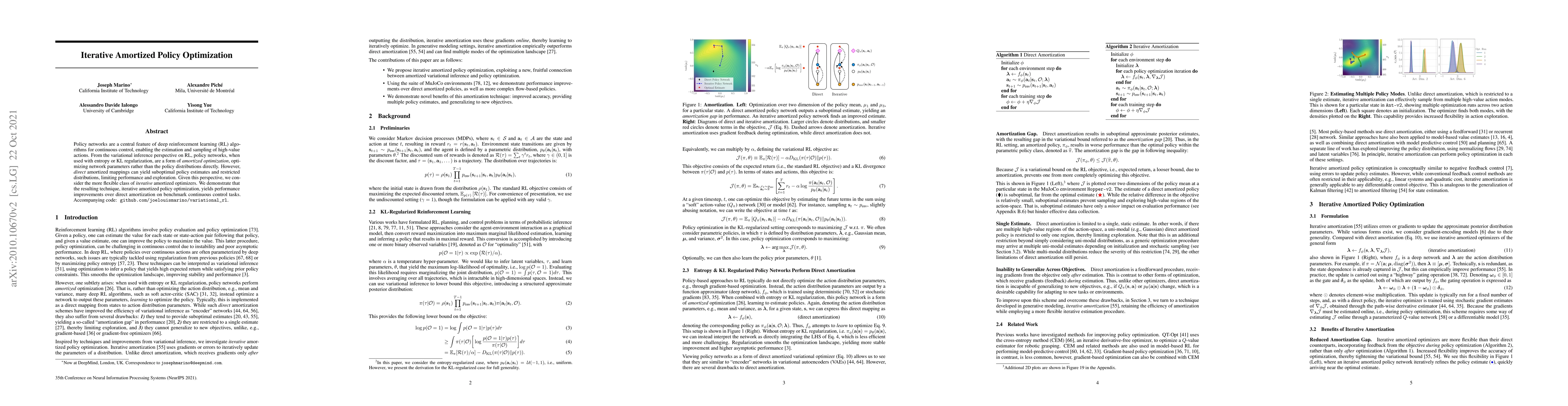 This paper proposes iterative amortized policy optimization, a method that improves upon direct amortized optimization in reinforcement learning by using a more flexible iterative approach, leading to better performance and exploration in continuous control tasks. The technique demonstrates superior results compared to direct amortized mappings on benchmark tasks.