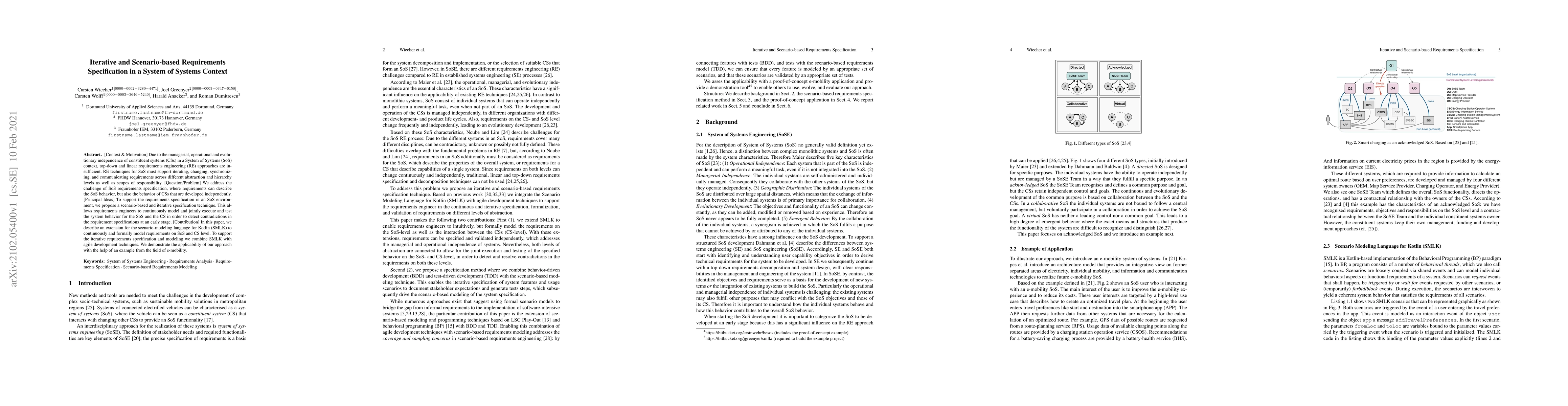 [Context&Motivation]Due to the managerial ,operational and evolutionary independence of constituent systems (CSs) in a System of Systems (SoS) context, top-down and linear requirements engineering (RE) approaches are insufficient. RE techniques for SoS must support iterating, changing, synchronizing, and communicating requirements across different abstraction and hierarchy levels as well as scopes of responsibility. [Question/Problem] We address the challenge of SoS requirements specification, where requirements can describe the SoS behavior, but also the behavior of CSs that are developed independently. [Principal Ideas] To support the requirements specification in an SoS environment, we propose a scenario-based and iterative specification technique. This allows requirements engineers to continuously model and jointly execute and test the system behavior for the SoS and the CS in order to detect contradictions in the requirement specifications at an early stage. [Contribution] In this paper, we describe an extension for the scenario-modeling language for Kotlin (SMLK) to continuously and formally model requirements on SoS and CS level. To support the iterative requirements specification and modeling we combine SMLK with agile development techniques. We demonstrate the applicability of our approach with the help of an example from the field of e-mobility.