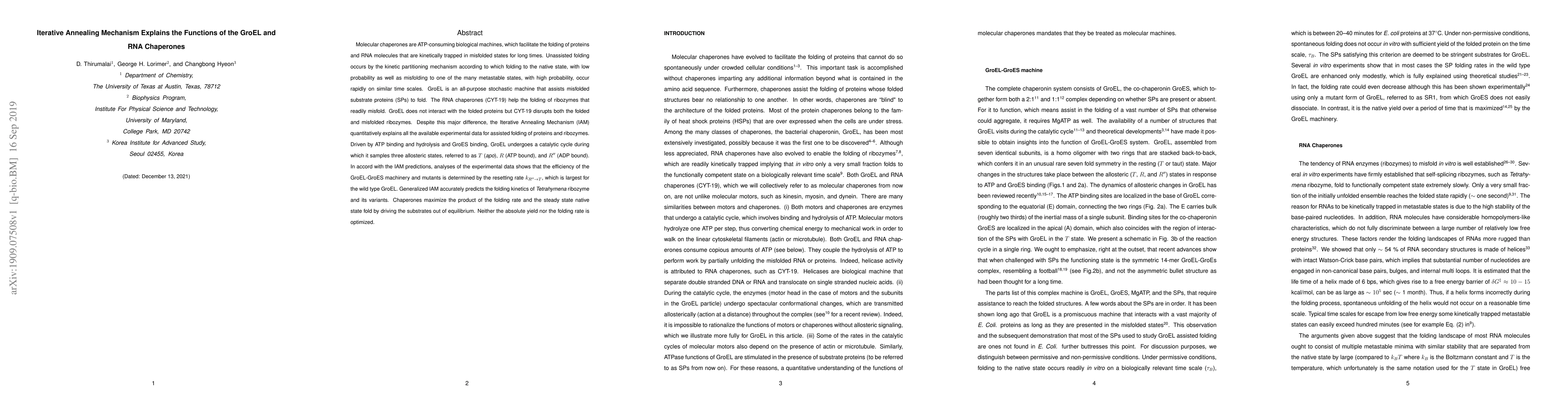 The Iterative Annealing Mechanism (IAM) explains the functions of GroEL and RNA chaperones in assisting protein and RNA folding. IAM quantitatively accounts for the folding kinetics of both proteins and ribozymes, showing that the efficiency of GroEL-GroES machinery is determined by the resetting rate $k_{R''\rightarrow T}$, which is highest in the wild type GroEL.