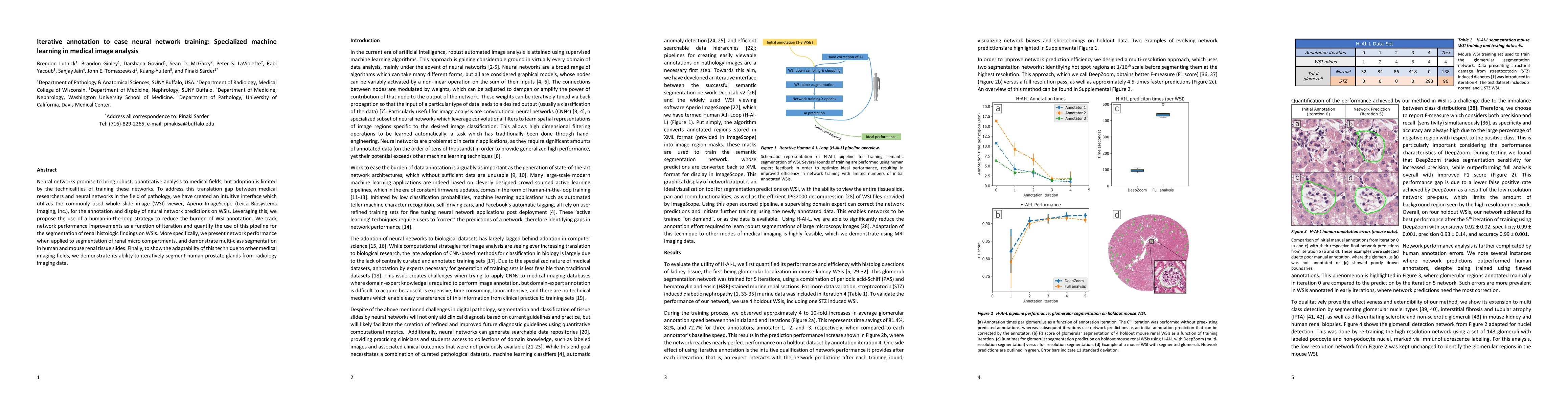 Neural networks promise to bring robust, quantitative analysis to medical fields, but adoption is limited by the technicalities of training these networks. To address this translation gap between medical researchers and neural networks in the field of pathology, we have created an intuitive interface which utilizes the commonly used whole slide image (WSI) viewer, Aperio ImageScope (Leica Biosystems Imaging, Inc.), for the annotation and display of neural network predictions on WSIs. Leveraging this, we propose the use of a human-in-the-loop strategy to reduce the burden of WSI annotation. We track network performance improvements as a function of iteration and quantify the use of this pipeline for the segmentation of renal histologic findings on WSIs. More specifically, we present network performance when applied to segmentation of renal micro compartments, and demonstrate multi-class segmentation in human and mouse renal tissue slides. Finally, to show the adaptability of this technique to other medical imaging fields, we demonstrate its ability to iteratively segment human prostate glands from radiology imaging data.