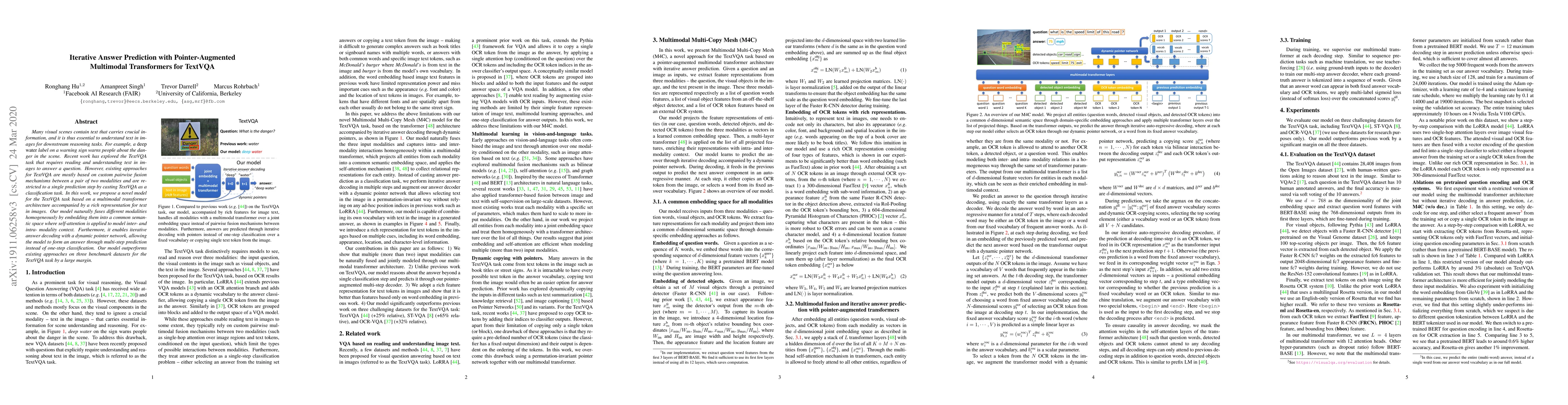 This paper proposes a novel model for TextVQA that uses a multimodal transformer architecture to fuse text and image information, enabling iterative answer decoding with a dynamic pointer network. The model outperforms existing approaches by a large margin on three benchmark datasets.