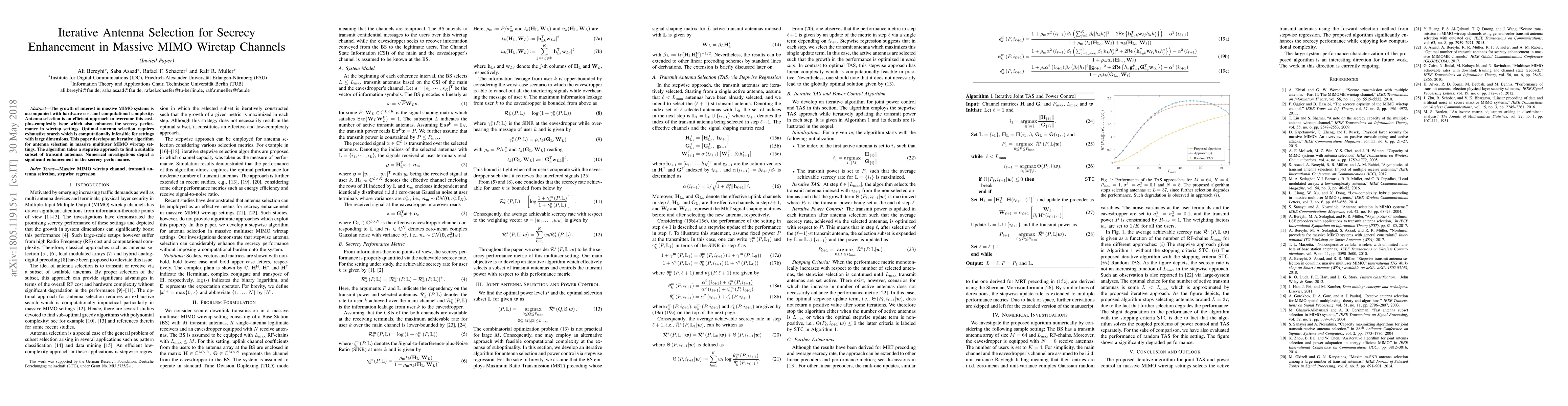 This paper proposes an iterative antenna selection algorithm to enhance secrecy in massive MIMO wiretap channels, addressing the high computational complexity of exhaustive search. The algorithm significantly improves secrecy performance through a stepwise approach to selecting transmit antennas.