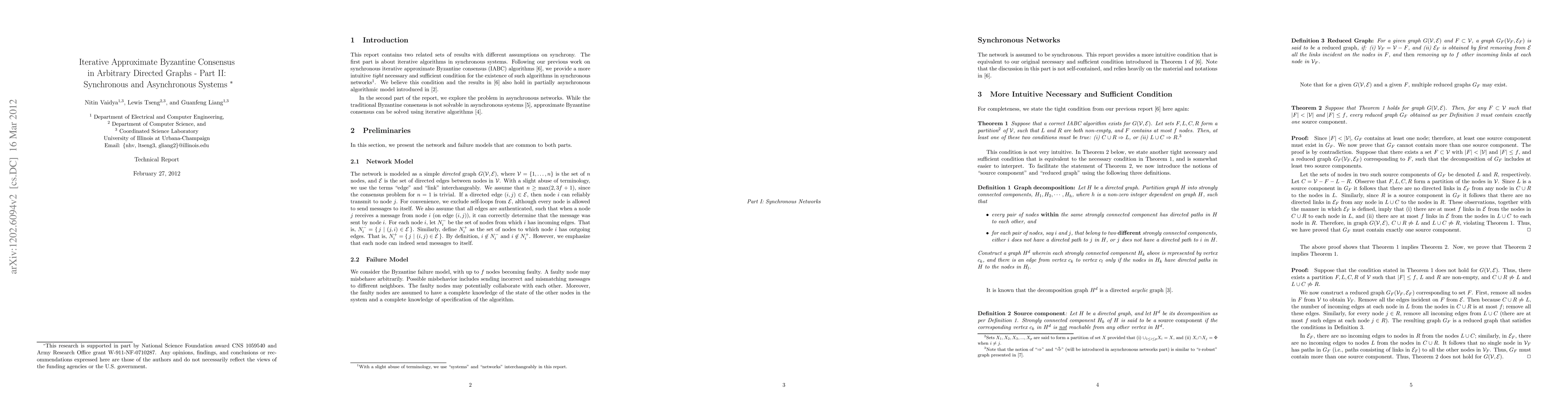 This report contains two related sets of results with different assumptions on synchrony. The first part is about iterative algorithms in synchronous systems. Following our previous work on synchronous iterative approximate Byzantine consensus (IABC) algorithms, we provide a more intuitive tight necessary and sufficient condition for the existence of such algorithms in synchronous networks1. We believe this condition and the previous results also hold in partially asynchronous algorithmic model. In the second part of the report, we explore the problem in asynchronous networks. While the traditional Byzantine consensus is not solvable in asynchronous systems, approximate Byzantine consensus can be solved using iterative algorithms.