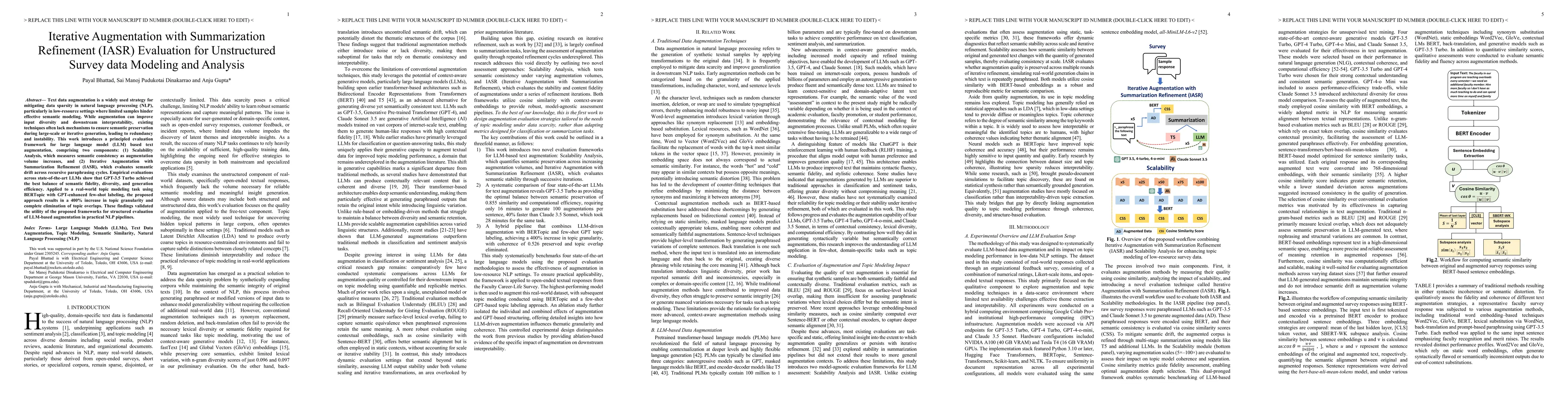 Text data augmentation is a widely used strategy for mitigating data sparsity in natural language processing (NLP), particularly in low-resource settings where limited samples hinder effective semantic modeling. While augmentation can improve input diversity and downstream interpretability, existing techniques often lack mechanisms to ensure semantic preservation during large-scale or iterative generation, leading to redundancy and instability. This work introduces a principled evaluation framework for large language model (LLM) based text augmentation, comprising two components: (1) Scalability Analysis, which measures semantic consistency as augmentation volume increases, and (2) Iterative Augmentation with Summarization Refinement (IASR), which evaluates semantic drift across recursive paraphrasing cycles. Empirical evaluations across state-of-the-art LLMs show that GPT-3.5 Turbo achieved the best balance of semantic fidelity, diversity, and generation efficiency. Applied to a real-world topic modeling task using BERTopic with GPT-enhanced few-shot labeling, the proposed approach results in a 400% increase in topic granularity and complete elimination of topic overlaps. These findings validated the utility of the proposed frameworks for structured evaluation of LLM-based augmentation in practical NLP pipelines.