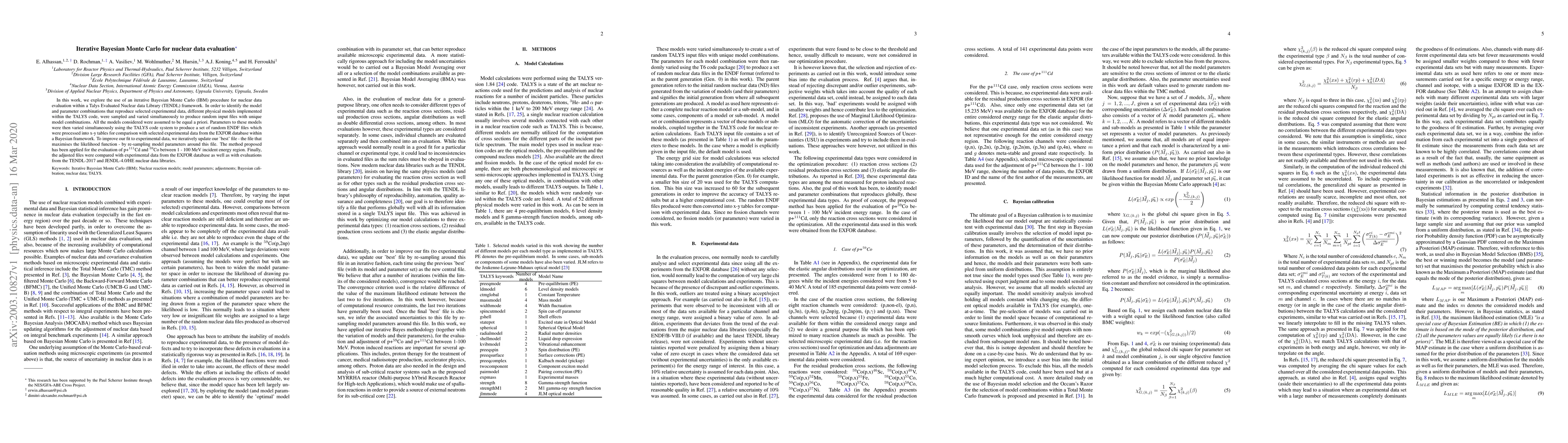 In this work, we explore the use of an iterative Bayesian Monte Carlo (IBM) procedure for nuclear data evaluation within a Talys Evaluated Nuclear data Library (TENDL) framework. In order to identify the model and parameter combinations that reproduce selected experimental data, different physical models implemented within the TALYS code, were sampled and varied simultaneously to produce random input files with unique model combinations. All the models considered were assumed to be equal a priori. Parameters to these models were then varied simultaneously using the TALYS code system to produce a set of random ENDF files which were processed into x-y tables for comparison with selected experimental data from the EXFOR database within a Bayesian framework. To improve our fit to experimental data, we iteratively update our 'best' file - the file that maximises the likelihood function - by re-sampling model parameters around this file. The method proposed has been applied for the evaluation of p+Cd-111 and Co-59 between 1 - 100 MeV incident energy region. Finally, the adjusted files were compared with experimental data from the EXFOR database as well as with evaluations from the TENDL-2017 and JENDL-4.0/HE nuclear data libraries.