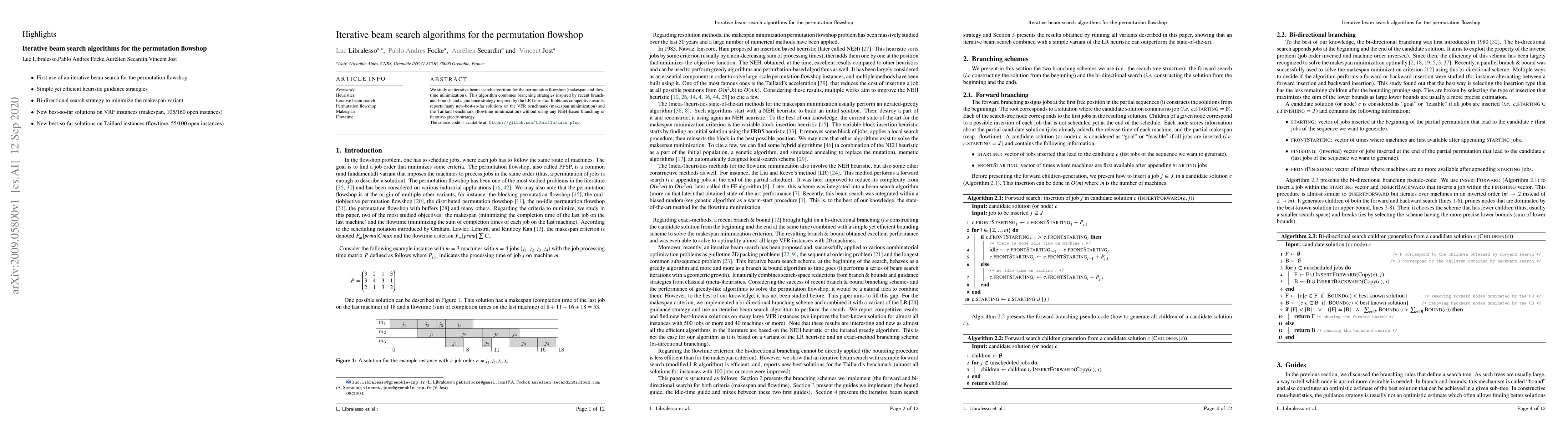 This paper proposes an iterative beam search algorithm for permutation flowshop scheduling, achieving competitive results in makespan and flowtime minimization without relying on NEH-based methods. The algorithm combines branching strategies and a heuristic-guided approach, reporting many new-best-solutions on benchmark datasets.