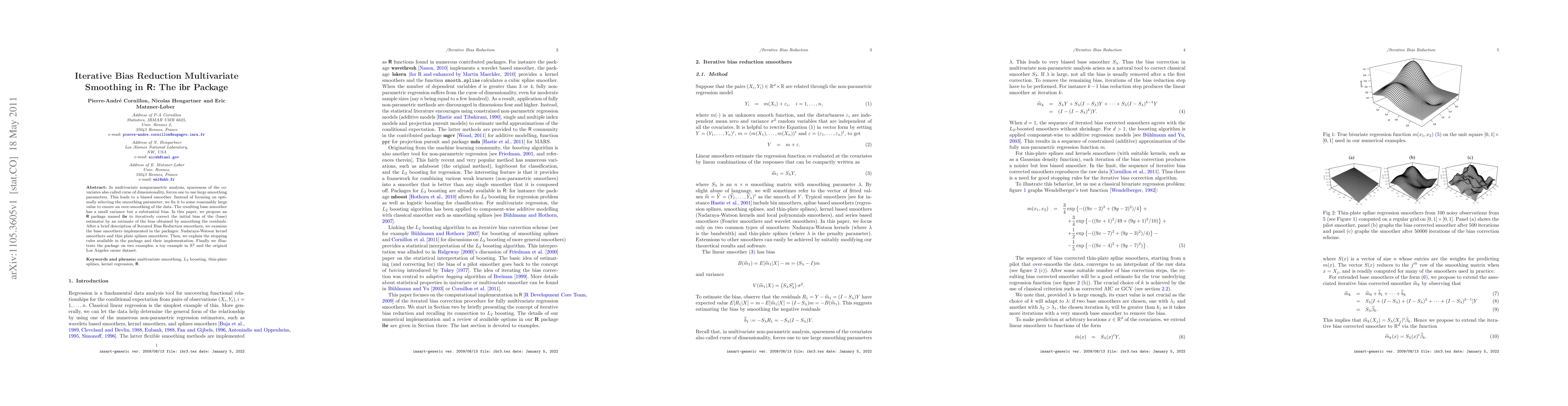 This paper introduces the ibr R package for iterative bias reduction in multivariate smoothing, addressing the curse of dimensionality by over-smoothing to reduce variance and then correcting the resulting bias through smoothing residuals. The package implements Nadaraya-Watson kernel and thin plate splines smoothers, and includes examples using a toy dataset and the Los Angeles ozone dataset.