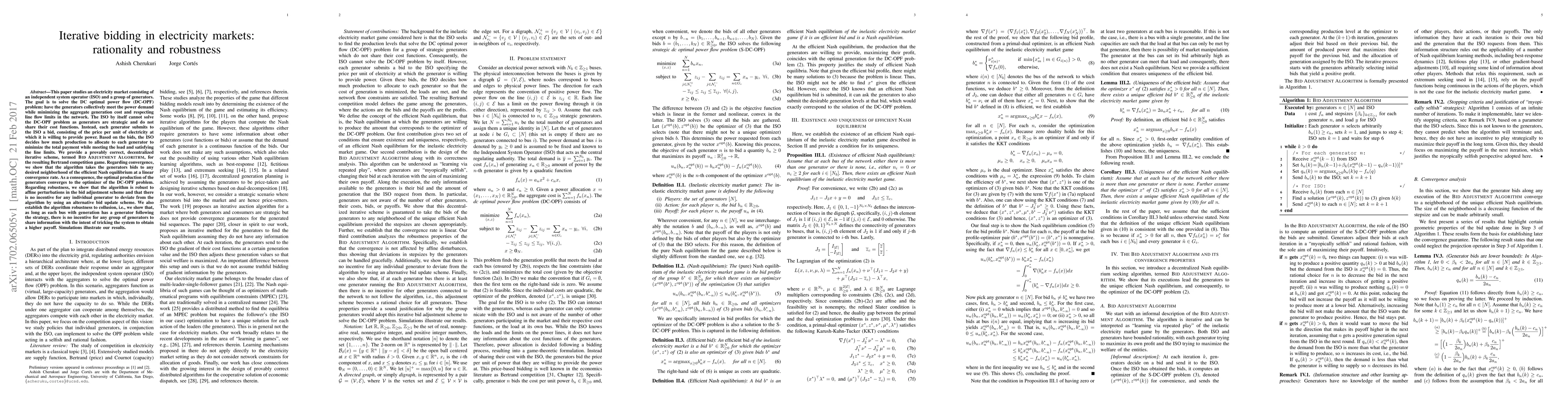 This paper studies an electricity market consisting of an independent system operator (ISO) and a group of generators. The goal is to solve the DC optimal power flow (DC-OPF) problem: have the generators collectively meet the power demand while minimizing the aggregate generation cost and respecting line flow limits in the network. The ISO by itself cannot solve the DC-OPF problem as generators are strategic and do not share their cost functions. Instead, each generator submits to the ISO a bid, consisting of the price per unit of electricity at which it is willing to provide power. Based on the bids, the ISO decides how much production to allocate to each generator to minimize the total payment while meeting the load and satisfying the line limits. We provide a provably correct, decentralized iterative scheme, termed BID ADJUSTMENT ALGORITHM, for the resulting Bertrand competition game. Regarding convergence, we show that the algorithm takes the generators' bids to any desired neighborhood of the efficient Nash equilibrium at a linear convergence rate. As a consequence, the optimal production of the generators converges to the optimizer of the DC-OPF problem. Regarding robustness, we show that the algorithm is robust to affine perturbations in the bid adjustment scheme and that there is no incentive for any individual generator to deviate from the algorithm by using an alternative bid update scheme. We also establish the algorithm robustness to collusion, i.e., we show that, as long as each bus with generation has a generator following the strategy, there is no incentive for any group of generators to share information with the intent of tricking the system to obtain a higher payoff. Simulations illustrate our results.