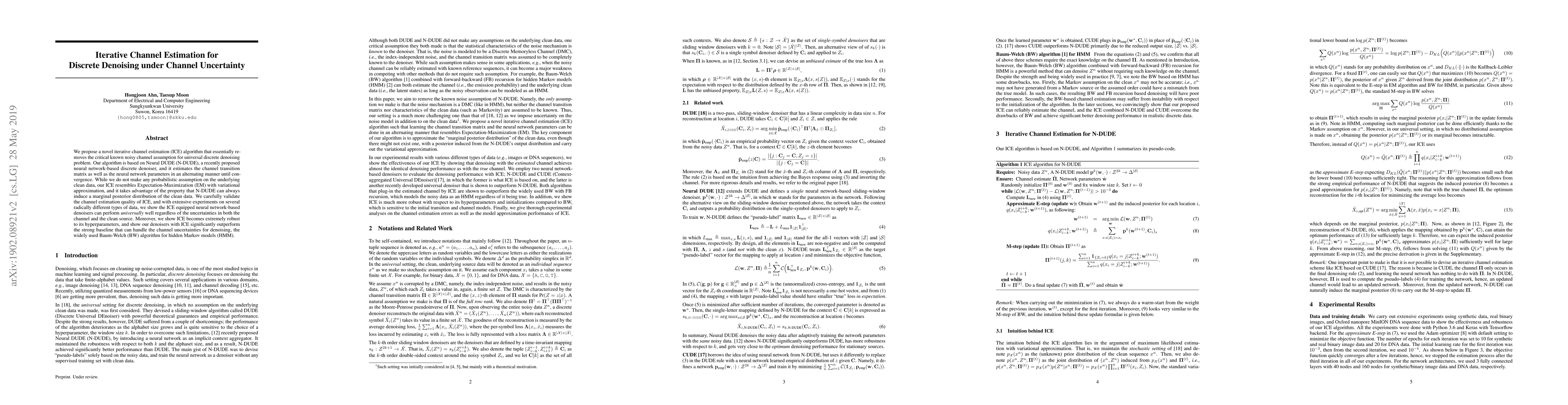 This paper proposes an iterative channel estimation (ICE) algorithm that removes the known noisy channel assumption for universal discrete denoising. The ICE algorithm, based on Neural DUDE, estimates channel and neural network parameters iteratively, achieving superior performance over the Baum-Welch algorithm, especially under channel uncertainties.