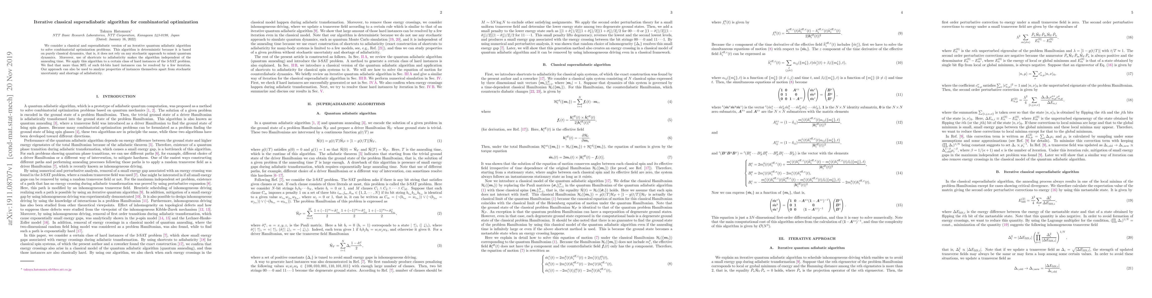 We consider a classical and superadiabatic version of an iterative quantum adiabatic algorithm to solve combinatorial optimization problems. This algorithm is deterministic because it is based on purely classical dynamics, that is, it does not rely on any stochastic approach to mimic quantum dynamics. Moreover, use of shortcuts to adiabaticity makes the algorithm independent of the annealing time. We apply this algorithm to a certain class of hard instances of the 3-SAT problem. We find that more than 90\% of such 64-bits hard instances can be resolved by a few iteration. Our approach can also be used to analyze properties of instances themselves apart from stochastic uncertainty and shortage of adiabaticity.