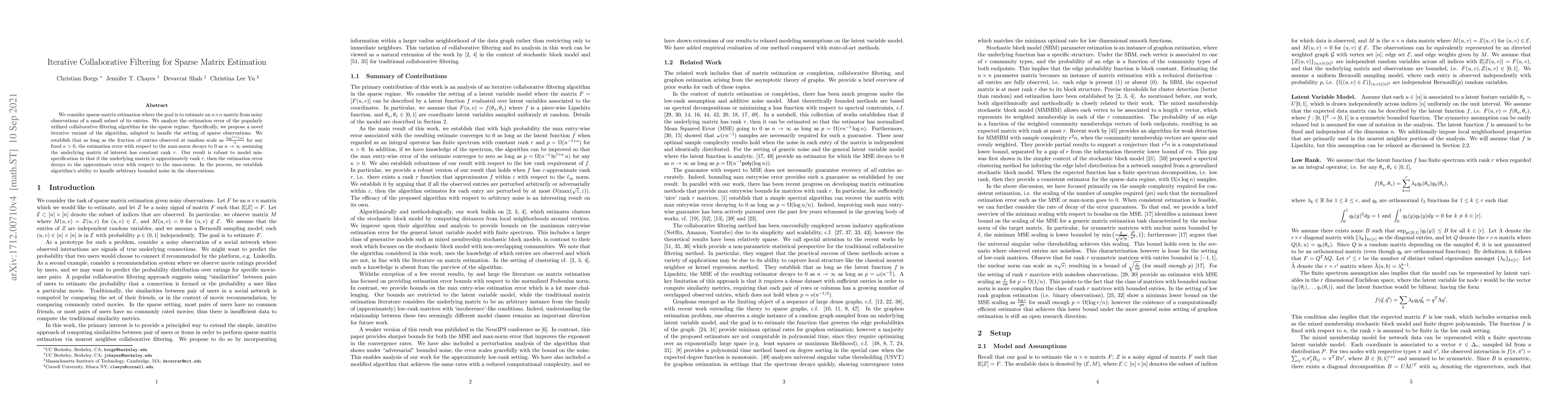 This paper proposes an iterative collaborative filtering algorithm for sparse matrix estimation, demonstrating that it can achieve zero estimation error as the number of observations grows, provided the observations are sufficiently dense. The algorithm is robust to rank mis-specification and can handle bounded noise in observations.