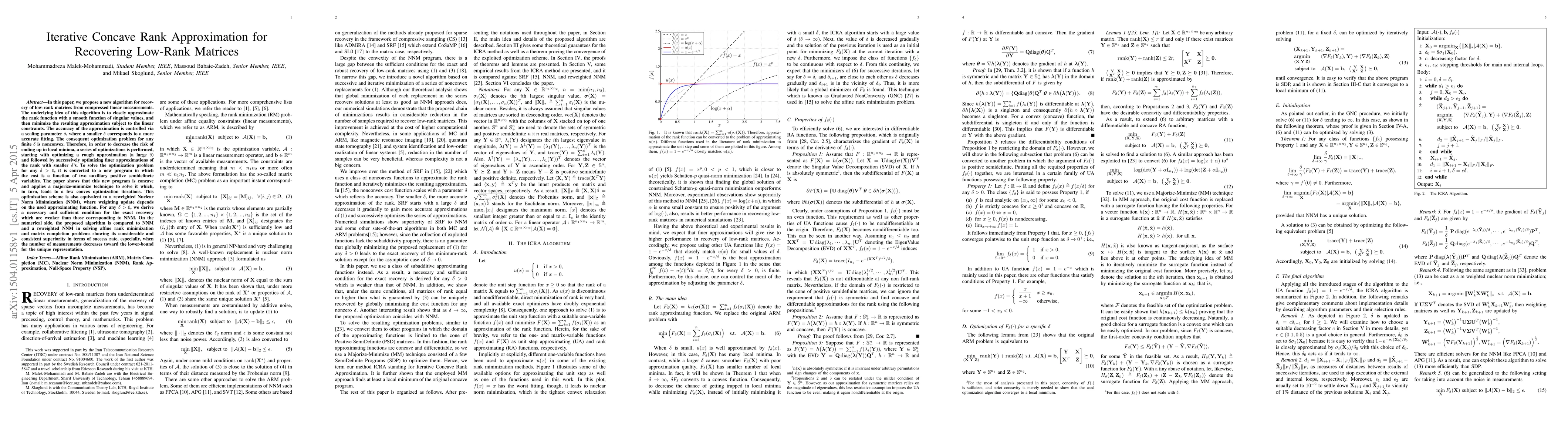 A new algorithm for recovering low-rank matrices from compressed measurements is proposed, using a concave rank approximation and iteratively refining the estimate to achieve accurate recovery with varying levels of precision.
