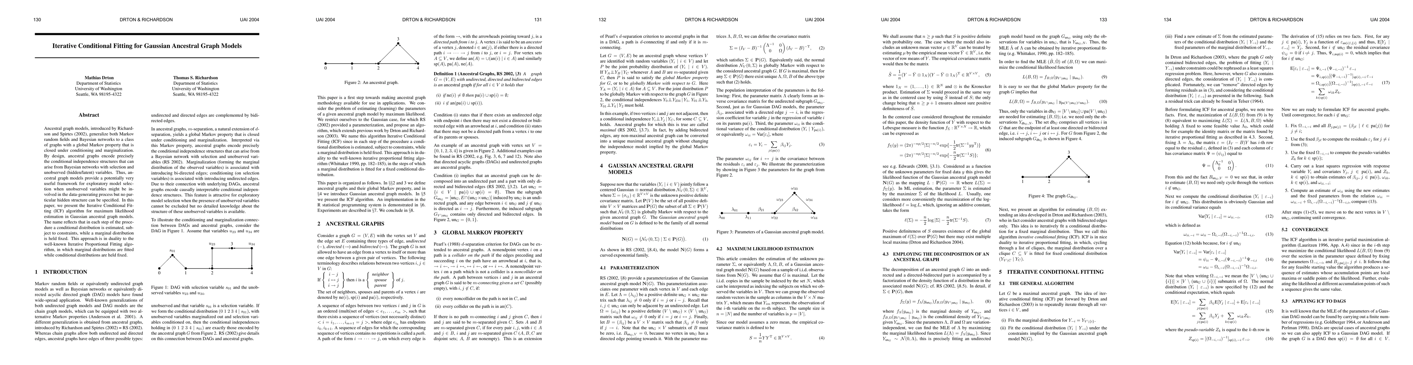 This paper introduces the Iterative Conditional Fitting (ICF) algorithm for estimating maximum likelihood in Gaussian ancestral graph models, which iteratively fits conditional distributions under constraints while holding marginal distributions fixed, contrasting with the Iterative Proportional Fitting method.