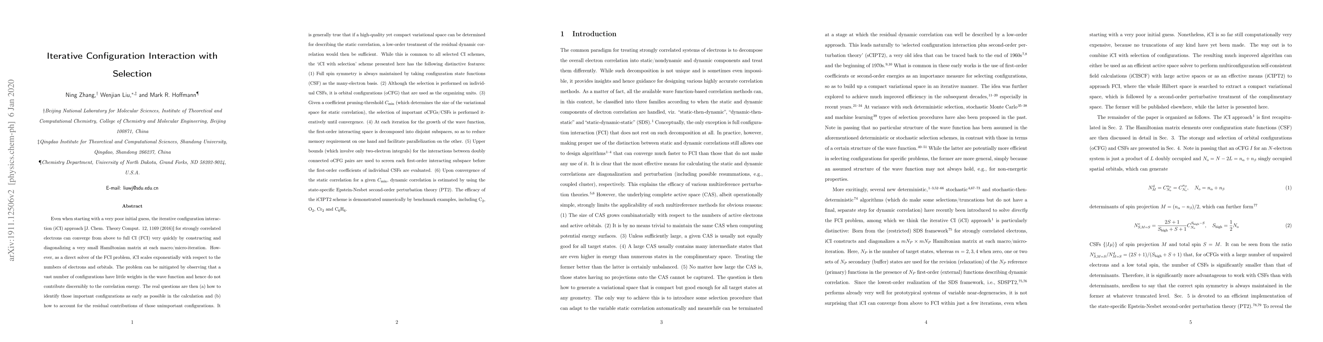 Even when starting with a very poor initial guess, the iterative configuration interaction (iCI) approach can converge from above to full CI very quickly by constructing and diagonalizing a small Hamiltonian matrix at each macro/micro-iteration. However, iCI scales exponentially with respect to the numbers of electrons and orbitals. The problem can be mitigated by observing that a vast number of configurations have little weights in the wave function and do not contribute to the correlation energy. The real questions are then (a) how to identify important configurations in the early stage of the calculation and (b) how to account for the residual contributions of those unimportant configurations. It is generally true that if a high-quality yet compact variational space can be determined for describing the static correlation, a low-order treatment of the residual dynamic correlation would be sufficient. While this is common to all selected CI schemes, the `iCI with selection' scheme presented here has the following distinctive features: (1) Full spin symmetry is maintained. (2) Although the selection is performed on individual CSFs, it is orbital configurations (oCFG) that are used as the organizing units. (3) Given a coefficient pruning-threshold, the selection of important oCFGs/CSFs is performed iteratively until convergence. (4) At each iteration for the growth of wave function, the first-order interacting space is decomposed into disjoint subspaces to reduce memory requirement and facilitate parallelization. (5) Upper bounds for the interactions between oCFG pairs are used to screen each first-order interacting subspace before the first-order coefficients of individual CSFs are evaluated. (6) Upon termination of the selection, dynamic correlation is estimated by using the ENPT2 theory. The efficacy of the iCIPT2 scheme is demonstrated numerically by taking several examples.