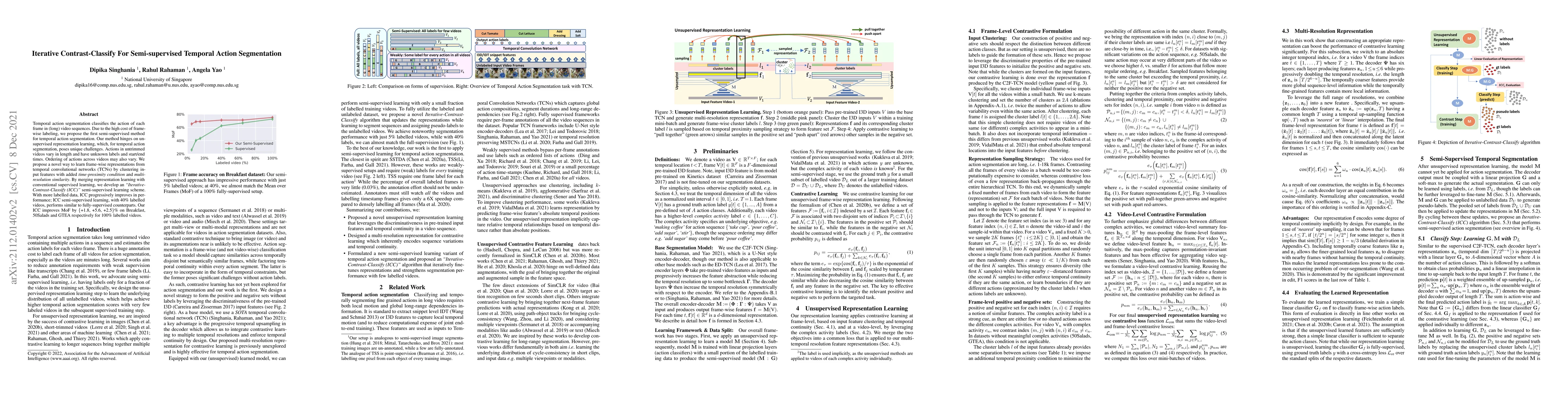 This paper proposes a semi-supervised method for temporal action segmentation using an "Iterative-Contrast-Classify (ICC)" scheme that leverages unsupervised representation learning. The method improves performance with more labeled data and achieves comparable results to fully-supervised methods using only 40% labeled videos.