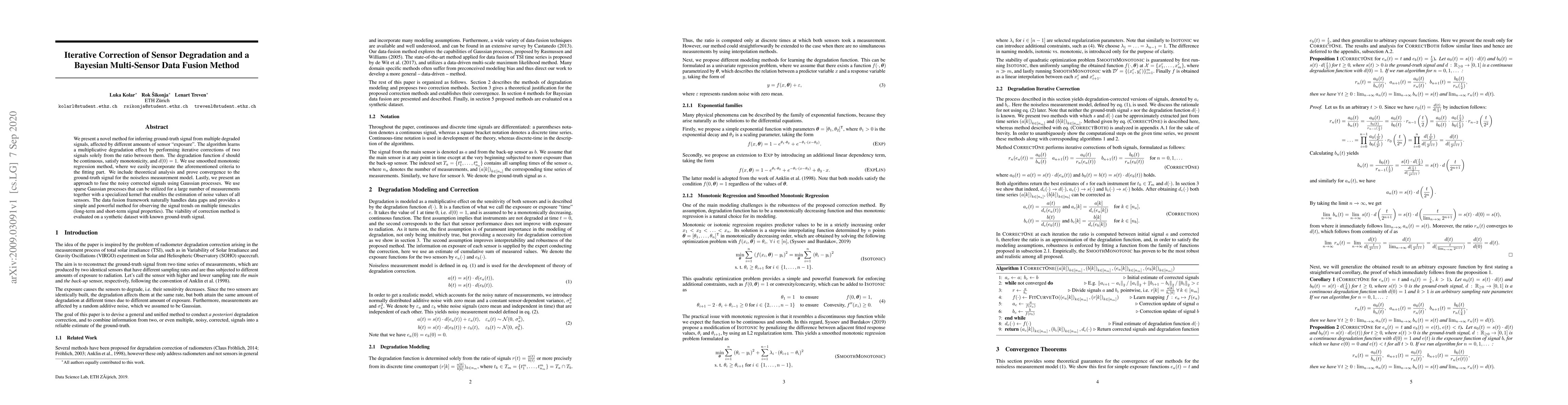 We present a novel method for inferring ground-truth signal from multiple degraded signals, affected by different amounts of sensor exposure. The algorithm learns a multiplicative degradation effect by performing iterative corrections of two signals solely from the ratio between them. The degradation function d should be continuous, satisfy monotonicity, and d(0) = 1. We use smoothed monotonic regression method, where we easily incorporate the aforementioned criteria to the fitting part. We include theoretical analysis and prove convergence to the ground-truth signal for the noiseless measurement model. Lastly, we present an approach to fuse the noisy corrected signals using Gaussian processes. We use sparse Gaussian processes that can be utilized for a large number of measurements together with a specialized kernel that enables the estimation of noise values of all sensors. The data fusion framework naturally handles data gaps and provides a simple and powerful method for observing the signal trends on multiple timescales(long-term and short-term signal properties). The viability of correction method is evaluated on a synthetic dataset with known ground-truth signal.