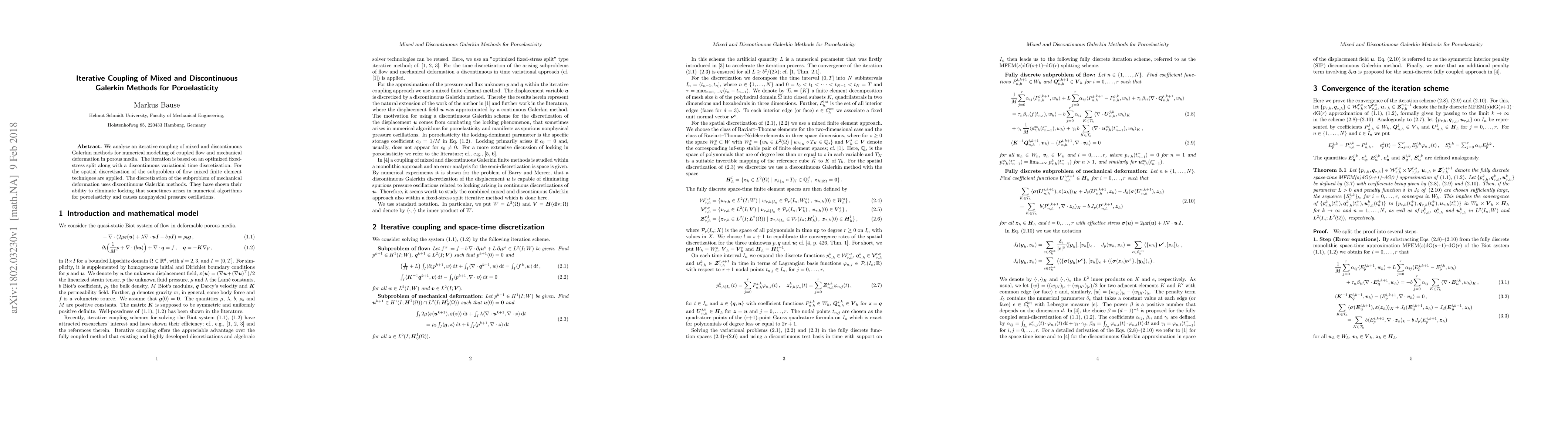 This paper investigates an iterative coupling of mixed finite element and discontinuous Galerkin methods for simulating coupled flow and mechanical deformation in porous media, employing an optimized fixed-stress split and a discontinuous variational time discretization. The approach aims to eliminate locking and nonphysical pressure oscillations typically seen in poroelasticity simulations.