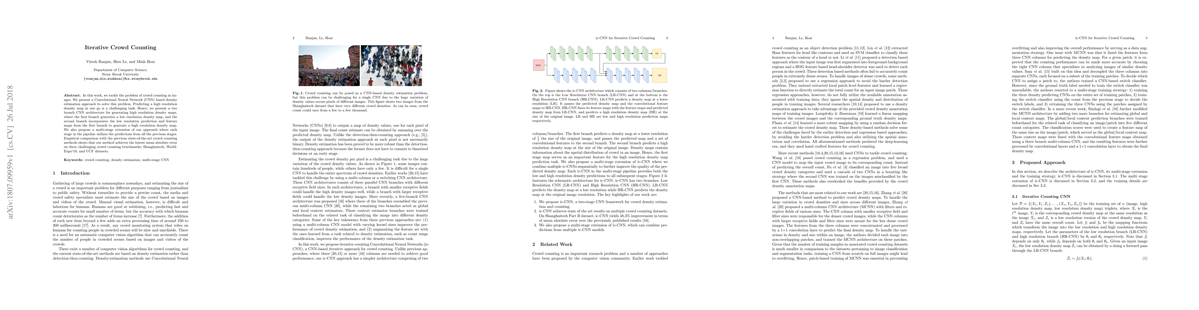 This paper proposes an iterative Convolutional Neural Network (CNN) approach for crowd counting in images, utilizing a two-branch architecture to generate high-resolution density maps. The method achieves state-of-the-art performance with the lowest mean absolute error on three benchmark datasets.