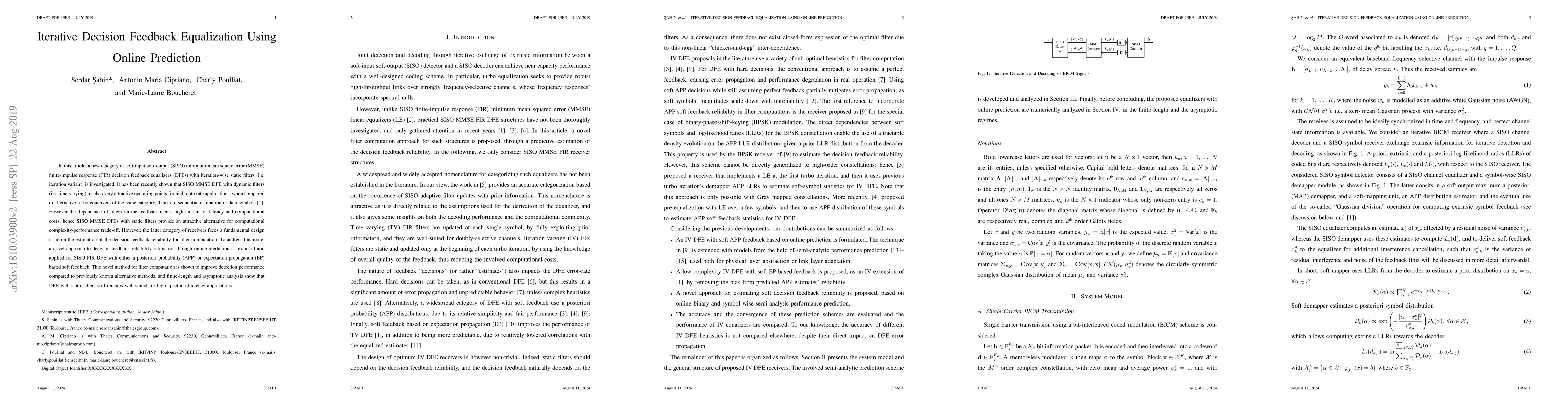 This paper proposes an iterative decision feedback equalizer (DFE) using online prediction for improved soft-input soft-output (SISO) minimum-mean square error (MMSE) filters, addressing the reliability estimation challenge in static filter implementations. The approach enhances detection performance while maintaining computational efficiency.