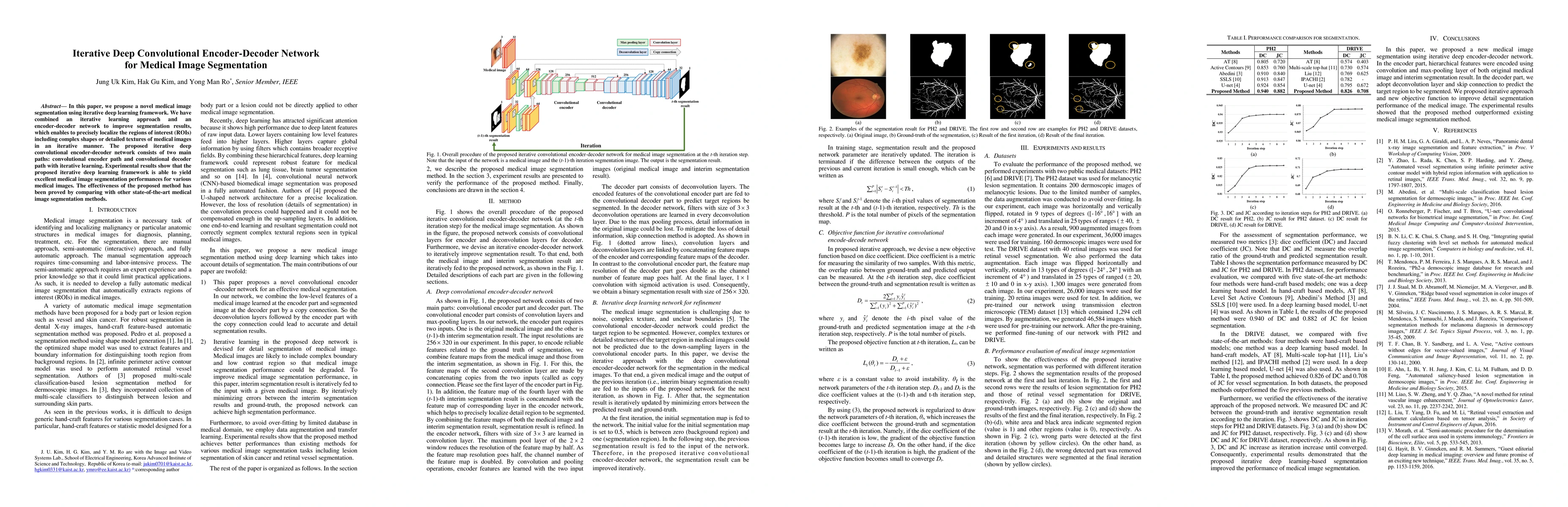 This paper introduces an iterative deep convolutional encoder-decoder network for medical image segmentation, combining iterative learning with an encoder-decoder framework to precisely localize complex regions of interest. Experimental results demonstrate superior performance compared to other state-of-the-art methods.