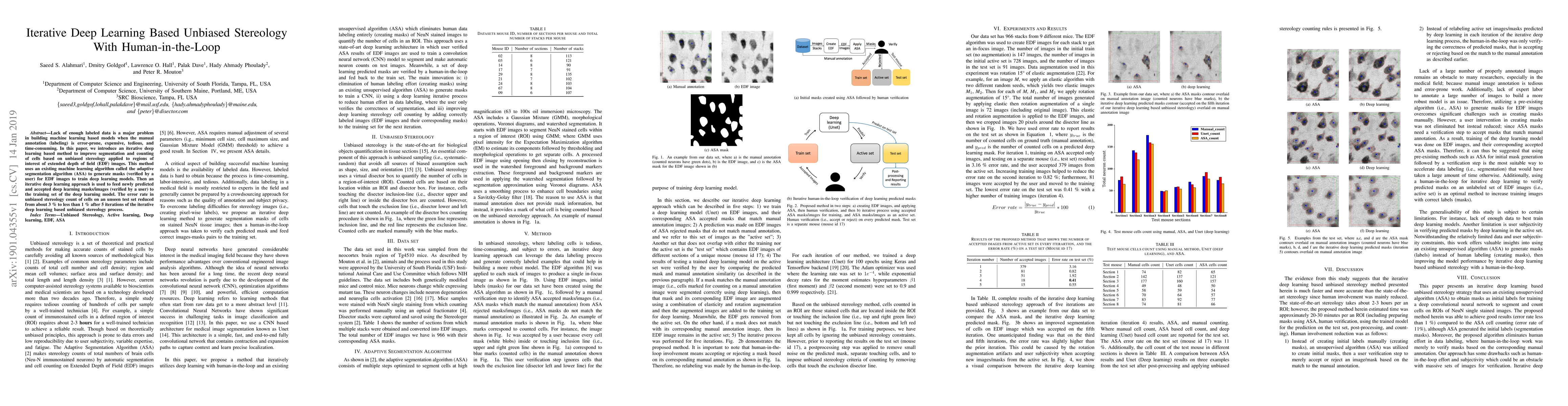 This paper proposes an iterative deep learning method to enhance cell segmentation and counting using unbiased stereology on extended depth of field images. By integrating human-in-the-loop verification, the error rate in cell counting is significantly reduced from 3% to less than 1% after five iterations.