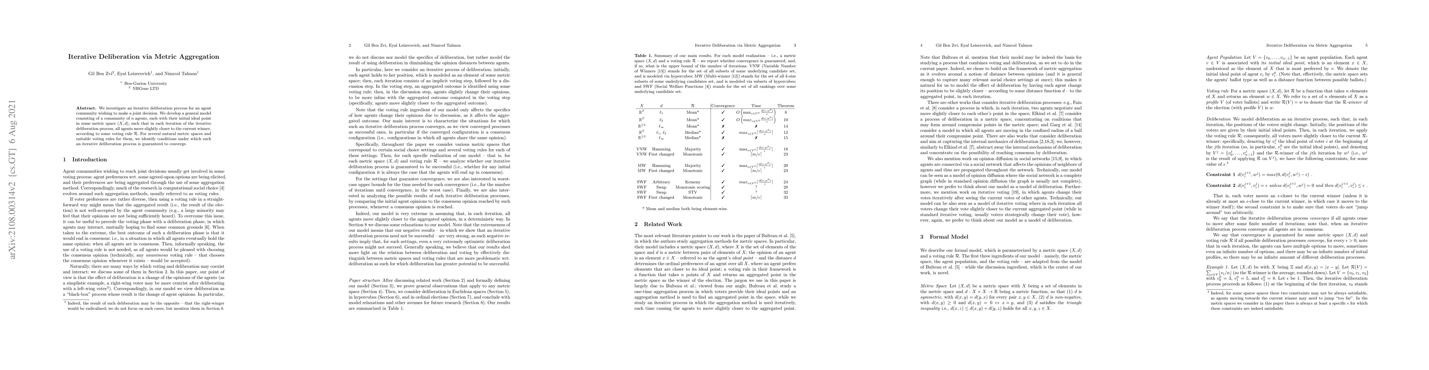 Researchers developed a model for an agent community to make joint decisions through iterative deliberation, identifying conditions under which it converges. They tested the model in several natural metric spaces with suitable voting rules.