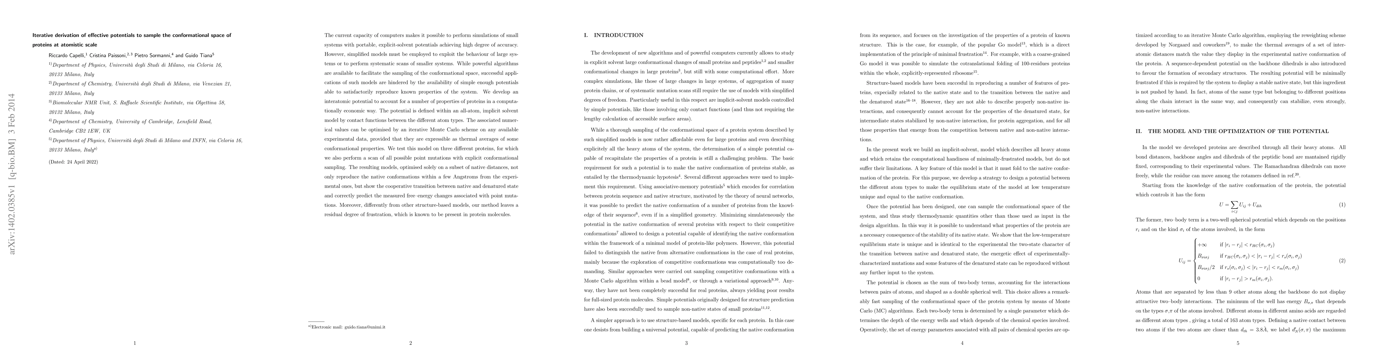 The current capacity of computers makes it possible to perform simulations of small systems with portable, explicit-solvent potentials achieving high degree of accuracy. However, simplified models must be employed to exploit the behaviour of large systems or to perform systematic scans of smaller systems. While powerful algorithms are available to facilitate the sampling of the conformational space, successful applications of such models are hindered by the availability of simple enough potentials able to satisfactorily reproduce known properties of the system. We develop an interatomic potential to account for a number of properties of proteins in a computationally economic way. The potential is defined within an all-atom, implicit solvent model by contact functions between the different atom types. The associated numerical values can be optimised by an iterative Monte Carlo scheme on any available experimental data, provided that they are expressible as thermal averages of some conformational properties. We test this model on three different proteins, for which we also perform a scan of all possible point mutations with explicit conformational sampling. The resulting models, optimised solely on a subset of native distances, not only reproduce the native conformations within a few Angstroms from the experimental ones, but show the cooperative transition between native and denatured state and correctly predict the measured free--energy changes associated with point mutations. Moreover, differently from other structure-based models, our method leaves a residual degree of frustration, which is known to be present in protein molecules.
