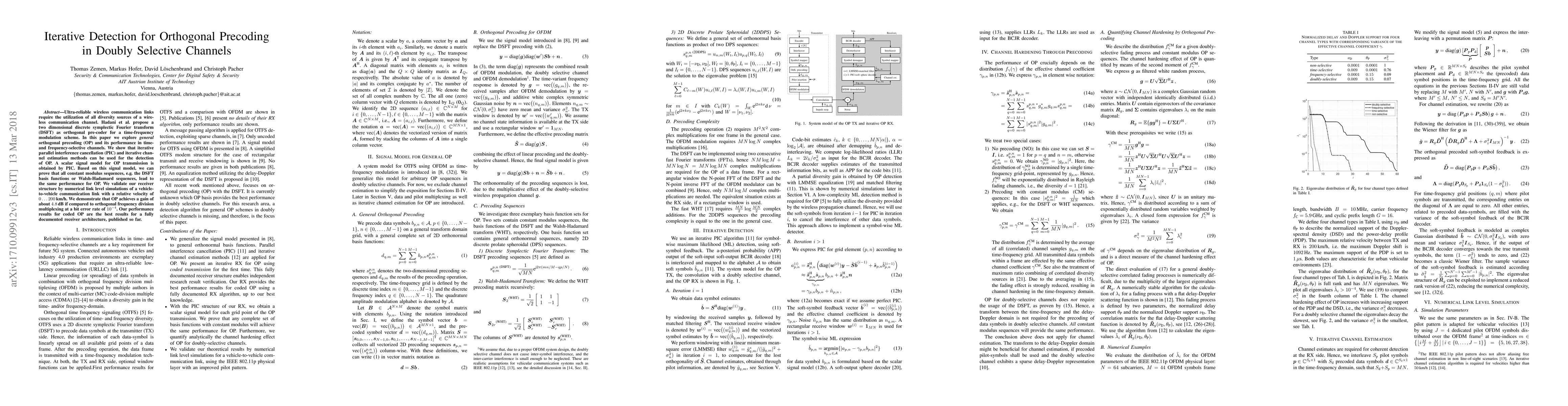 Ultra-reliable wireless communication links require the utilization of all diversity sources of a wireless communication channel. Hadani et al. propose a two dimensional discrete symplectic Fourier transform (DSFT) as orthogonal pre-coder for a time-frequency modulation scheme. In this paper we explore \emph{general} orthogonal precoding (OP) and its performance in time- and frequency-selective channels. We show that iterative parallel interference cancellation (PIC) and iterative channel estimation methods can be used for the detection of OP. A scalar signal model for OP transmission is obtained by PIC. Based on this signal model, we can prove that all constant modulus sequences, e.g. the DSFT basis functions or Walsh-Hadamard sequences, lead to the same performance for OP. We validate our receiver structure by numerical link level simulations of a vehicle-to-vehicle communication link with a relative velocity of $0\ldots200\,\text{km/h}$. We demonstrate that OP achieves a gain of about $4.8\,\text{dB}$ if compared to orthogonal frequency division multiplexing at a bit error rate of $10^{-4}$. Our performance results for coded OP are the best results for a fully documented receiver architecture, published so far.