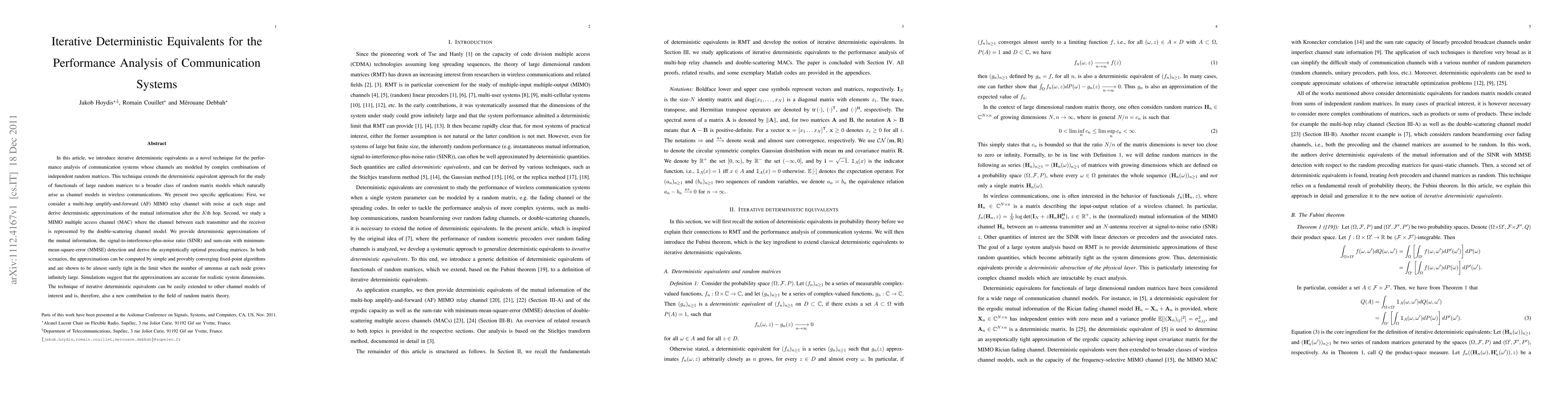 This paper proposes iterative deterministic equivalents for analyzing communication systems with complex channel models represented by independent random matrices. The technique provides deterministic approximations for mutual information and SINR in multi-hop MIMO relay channels and MIMO MACs, showing accuracy even for practical dimensions and potential for broader application.