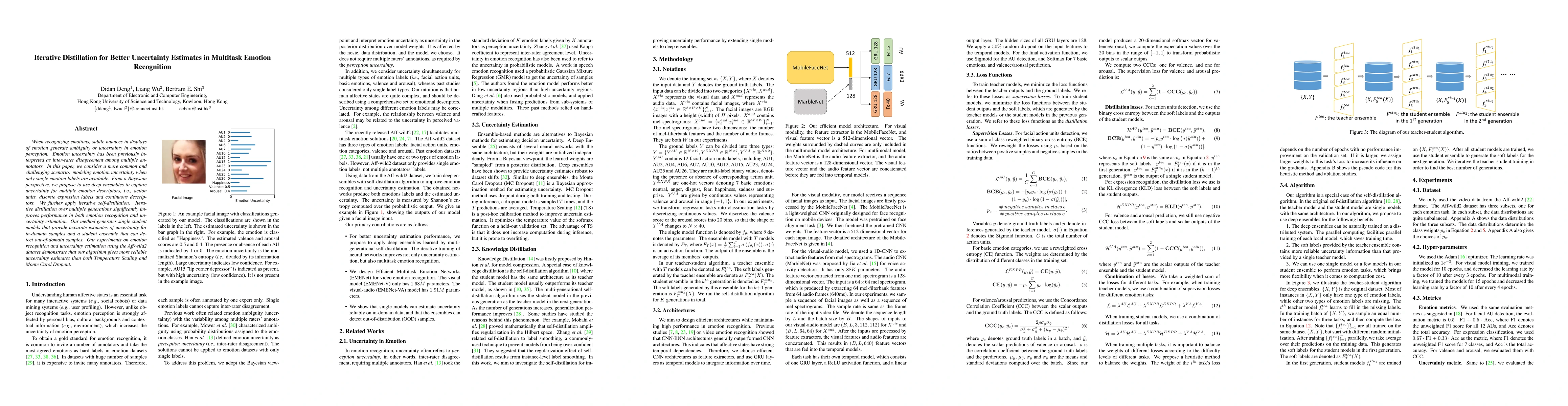 When recognizing emotions, subtle nuances in displays of emotion generate ambiguity or uncertainty in emotion perception. Emotion uncertainty has been previously interpreted as inter-rater disagreement among multiple annotators. In this paper, we consider a more common and challenging scenario: modeling emotion uncertainty when only single emotion labels are available. From a Bayesian perspective, we propose to use deep ensembles to capture uncertainty for multiple emotion descriptors, i.e., action units, discrete expression labels and continuous descriptors. We further apply iterative self-distillation. Iterative distillation over multiple generations significantly improves performance in both emotion recognition and uncertainty estimation. Our method generates single student models that provide accurate estimates of uncertainty for in-domain samples and a student ensemble that can detect out-of-domain samples. Our experiments on emotion recognition and uncertainty estimation using the Aff-wild2 dataset demonstrate that our algorithm gives more reliable uncertainty estimates than both Temperature Scaling and Monte Carol Dropout.