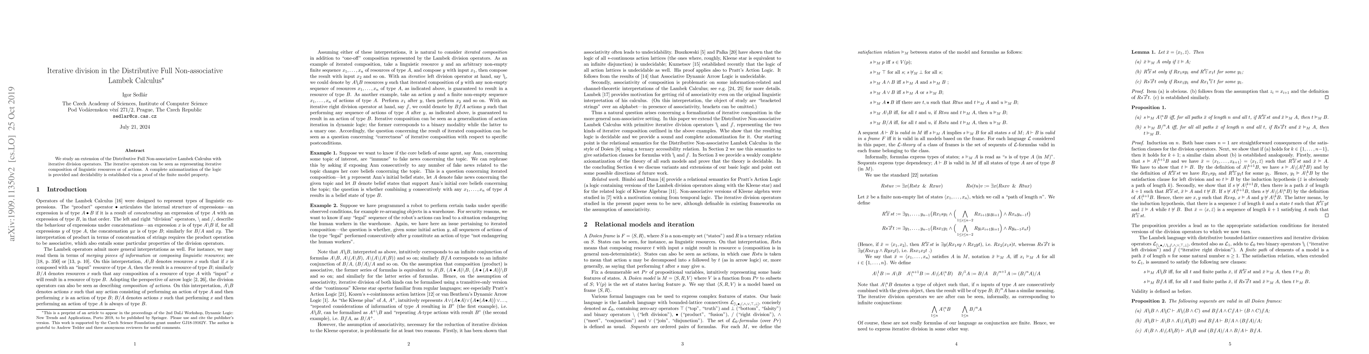 We study an extension of the Distributive Full Non-associative Lambek Calculus with iterative division operators. The iterative operators can be seen as representing iterative composition of linguistic resources or of actions. A complete axiomatization of the logic is provided and decidability is established via a proof of the finite model property.
