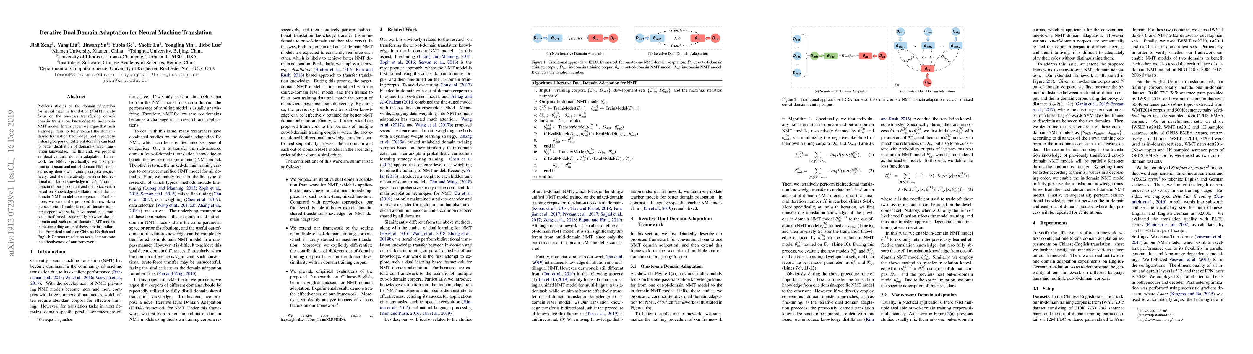 This paper proposes an iterative dual domain adaptation framework for neural machine translation (NMT) that aims to better extract domain-shared translation knowledge through bidirectional knowledge transfer between in-domain and out-of-domain models. Empirical results show improved translation performance on Chinese-English and English-German tasks.