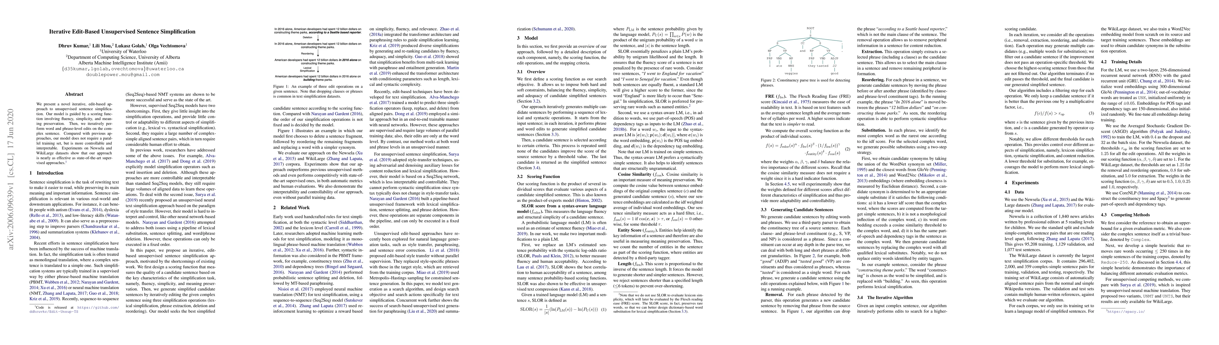 This paper introduces an iterative, edit-based method for unsupervised sentence simplification, guided by a scoring function for fluency, simplicity, and meaning preservation. Unlike previous methods, it does not require a parallel training set, demonstrating competitive performance on Newsela and WikiLarge datasets.