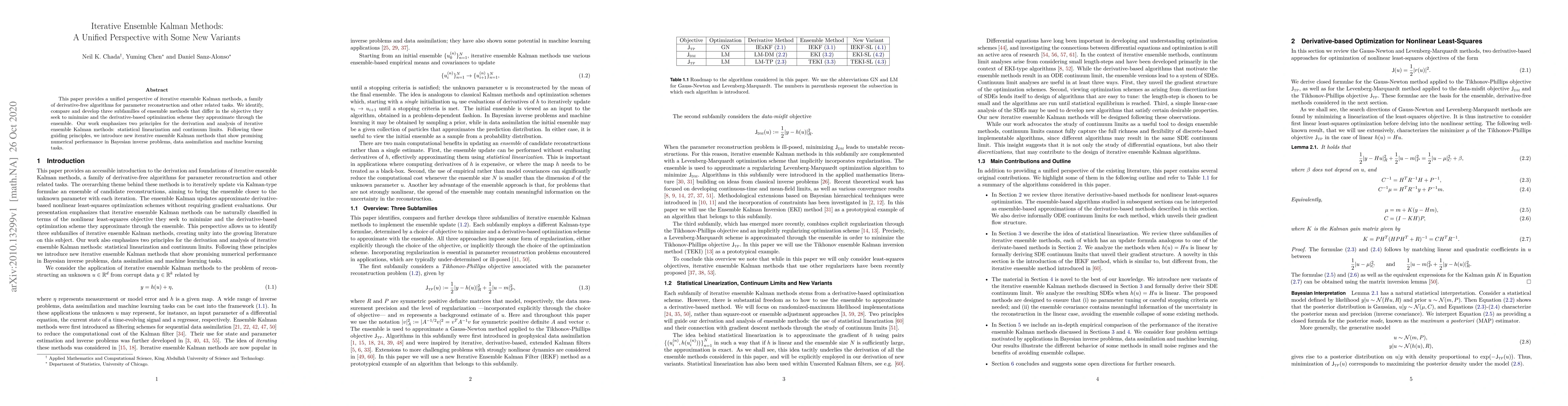 This paper provides a unified perspective of iterative ensemble Kalman methods, a family of derivative-free algorithms for parameter reconstruction and other related tasks. We identify, compare and develop three subfamilies of ensemble methods that differ in the objective they seek to minimize and the derivative-based optimization scheme they approximate through the ensemble. Our work emphasizes two principles for the derivation and analysis of iterative ensemble Kalman methods: statistical linearization and continuum limits. Following these guiding principles, we introduce new iterative ensemble Kalman methods that show promising numerical performance in Bayesian inverse problems, data assimilation and machine learning tasks.